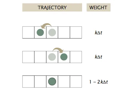 Let’s be more explicit and draw some cartoons. Let’s imagine that we live in a one-dimensional world. Along this dimension, we have a string of boxes of a width a=1 which can either be empty or contain a particle. At any point in time, a given particle can move to either the left or right at some rate k, which we’ll call the jump frequency, or it can stay put.