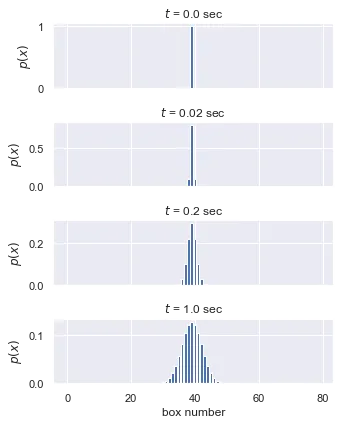 We can see that as we defined, the entire probability at t=0 is located within the middle of the box. However, just one time point later, we can see that there is now non-zero probability at being to the left or right of where we started. By ten time steps, we can see that the distribution is broadening significantly. By 100 steps, the profile looks very Gaussian.