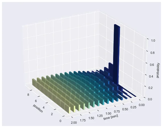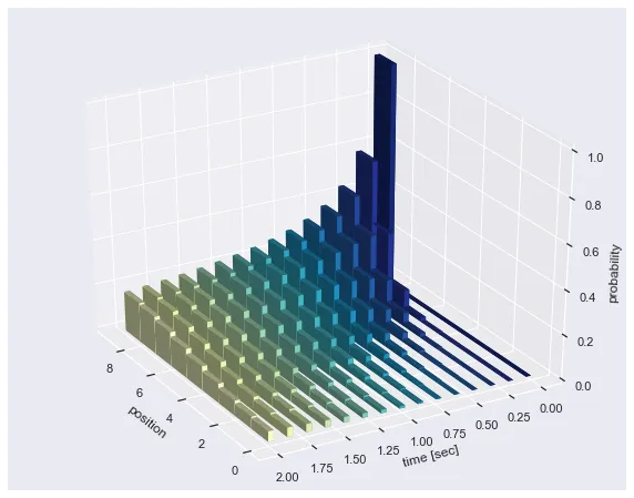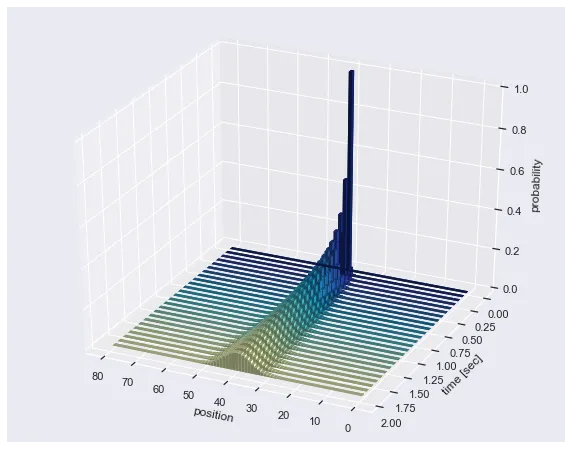 Again, this follows (more or less) our intuition. As time goes on, the distribution spreads out, eventually reaching the end of the box. Notice here, that 2 seconds isn’t enough to completely fill the box where each position has equal probability.