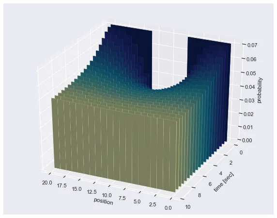 Here, we took just a few slices of the time evolution. To get a more refine picture of how it is broadening, we can look at the entire trace in 3D as a bar plot where is position, is time, and is probability. This can be a bit hard to code, so I’ve taken the liberty of writing a function for you that will generate this plot. To get the function, download the cbbtn_utilities.py file and place it in your root working directory. Within this file is a function called bar_plot. All we have to give this function is our matrix of probabilities, information about the step sizes (in time and in position), as well as the relevant angles. Let’s give it a shot.
