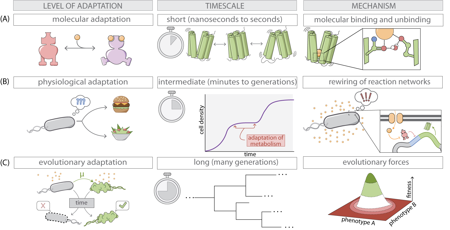 From archaea thriving in hydrothermal vents on the ocean floor to aspen trees dominating a Coloradan mountainside, all forms of life are unified in their obedience to (and influence on) their environment. Whether it be the stochastic events that can trigger mass extinctions (Jablonski 2001) or the rapid “terraforming” of environments by their inhabitants (such as the rusting of the oceans (Luo et al. 2018)), organisms and their environments are continually engaged in a dialogue that demands the ability to adapt. Over the past 3.5 billion years of evolution, life has evolved myriad clever ways to combat (and exploit) environmental fluctuations to amplify reproductive success. The mechanisms behind this adaptation are diverse and traverse the biological scales, ranging from nanosecond-scale conformational switching of proteins (Fig. 1 (A)), to reconfiguration of metabolic networks to consume different sugars (Fig. 1 (B)), to evolutionary trajectories that only become visible over many generations (Fig. 1 (C)). While “adaptation” is typically only associated with organisms (at least colloquially), one can use the same language to describe the microscopic operations of molecules.