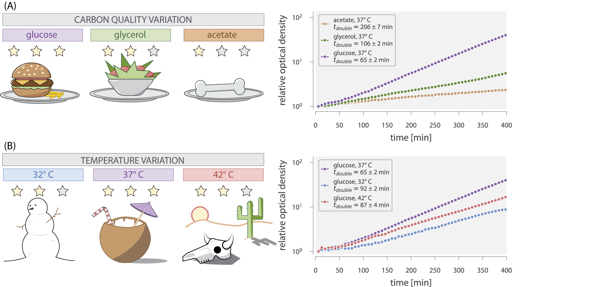 In Chapter 4 of this dissertation, we quantitatively assess these assumptions in the context of gene expression by considering the theoretical models built in Chapters 2 and 3 and directly measuring the adaptability of the inducible simple repression regulatory architecture across different physiological states. Namely, we explore how predictive our thermodynamic model can be when modulating either the quality of the carbon source (glucose, glycerol, or acetate, Fig. 10 (A)) or by changing the temperature of the growth medium (32∘ C, 37∘ C, or 42∘ C, Fig. 10 (B)). The culture doubling time varies by nearly a factor of four across the different conditions, illustrating the diversity in physiological states.