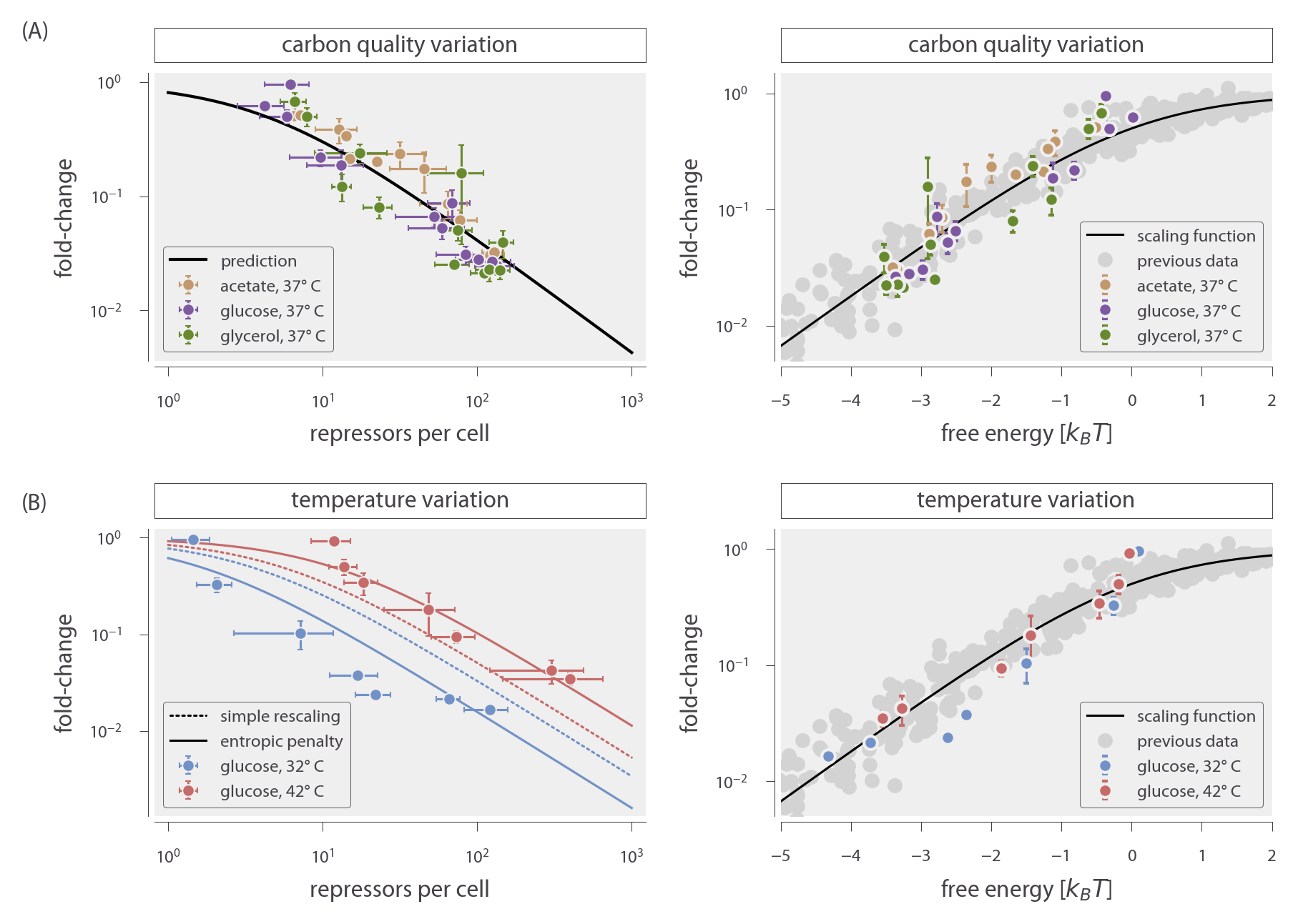 ch1_fig10.py) used to generate this figure can be accessed via the thesis GitHub repository.How could this variation in cellular physiology be incorporated into our thermodynamic model? Up to this point in this thesis, all experiments have been conducted in a growth medium supplemented with glucose held at a balmy 37∘ C. However, nowhere in the thermodynamic model schematized in Fig. 4 (B) is it specified which carbon source must be present whereas the temperature of the system is explicitly included as a multiplicative factor β = (kBT) − 1 in front of the exponentiated terms. These features of the model allow us to make explicit predictions of how these perturbations should influence the observed fold-change in gene expression, if at all.