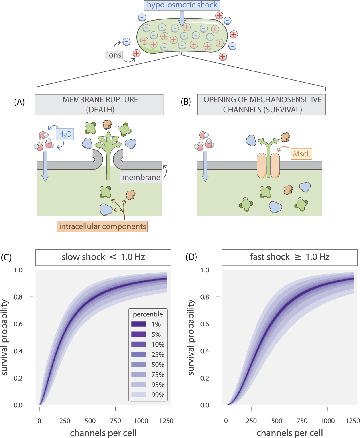 ch1_fig12.py) used to generate this figure can be accessed via the thesis GitHub repository.While we leave the details of the inference to Chapter 5 and the supplemental Chapter 9, the survival probability as a function of the total mechanosensitive channel number is given for “slow” and “fast” osmotic shocks in Fig. 12 (C) and (D), respectively. The credible regions in this plot illustrate that for an ≈ 80% chance of surviving either a slow or a fast osmotic shock, at least ≈ 500 channels are needed. This number is in agreement with recent proteomic measurements in E. coli (Li et al. 2014; Schmidt et al. 2016; Soufi et al. 2015), but are at odds with current theoretical models. While it is difficult to theoretically define a survival/death criterion, current physical models predict that only a few mechanosensitive channels (specifically MscL) are needed to relieve even large increases in membrane tension. These findings illustrate another avenue in which the disagreement between theory and careful, quantitative experiments reveal gaps in our understanding of fundamental biological phenomena.
