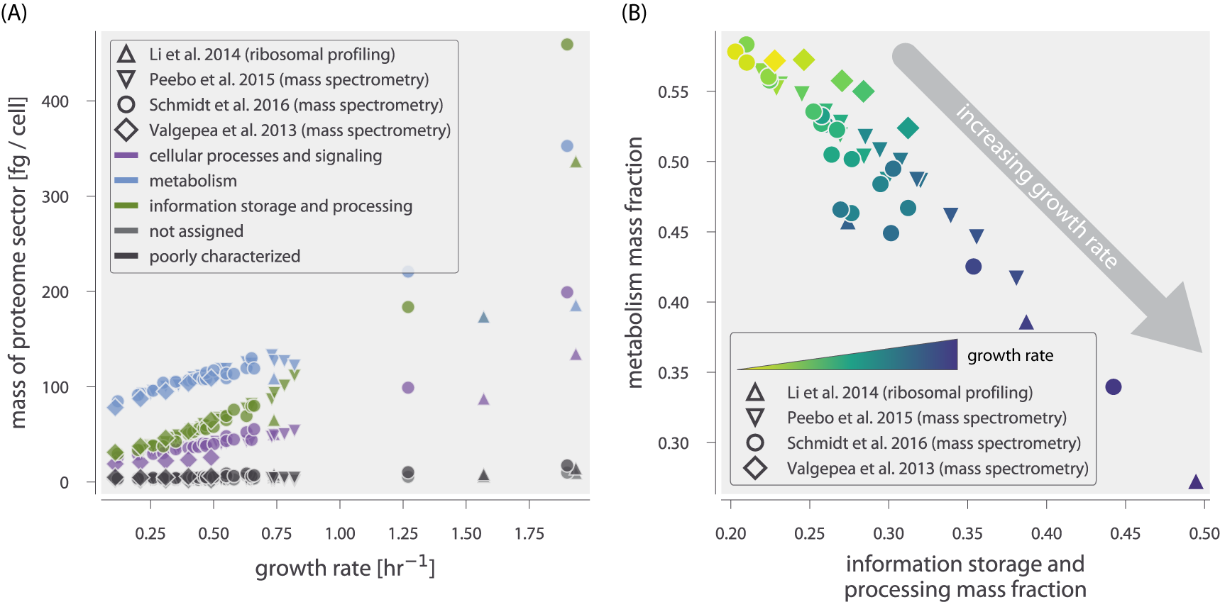 In collaboration again with Nathan M. Belliveau, we have begun to explore how the composition of the bacterial proteome is structured at the single-protein level. Fig. 13 (A) shows data compiled from several independent proteomic data sets (using either quantitative mass spectrometry (Schmidt et al. 2016; Peebo et al. 2015; Valgepea et al. 2013a) or ribosomal profiling (Li et al. 2014)) where the abundance of different molecular constituents of the bacterial proteome is plotted as a function of the growth rate. These components, broken down by their functional designation according to their Cluster of Orthologous Groups (COG) annotation (Galperin et al. 2015), reveal varied dependencies on the growth rate. Of note are the COG classes “cellular processes and signaling,” “metabolism,” and “information storage and processing” which all appear to have a correlation between the cellular growth rate and the total mass of that proteome sector. However, when plotted as the total mass fraction of the proteome instead of the total mass, a striking result is observed. Fig. 13 (B) reveals a very strong, negative correlation between the mass fraction of the proteome dedicated to information storage and processing (including ribosomal and transcriptional machinery) and the proteome fraction dedicated to metabolism. This direct competition for resources between the proteins involved in translation (ribosomes, elongation factors, etc.) and metabolic networks has been shown previously (Klumpp and Hwa 2008; Scott et al. 2010; Hui et al. 2015) and suggests a strong evolutionary constraint on how resources can be optimally partitioned.