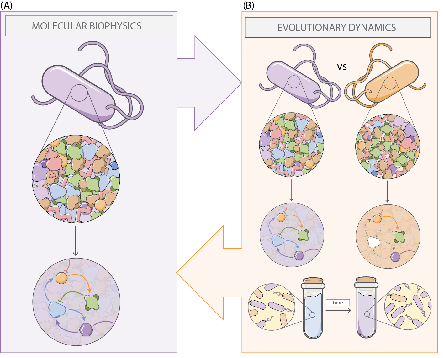ch1_fig13.py) used to generate this figure can be accessed via the thesis GitHub repository.As of this writing, our understanding of the cellular resource allocation visible in Fig. 13 remains largely phenomenological (Scott et al. 2014). This is in part due to the tremendously high-dimensional nature of systems-level organization. Our understanding of systems with such huge numbers of degrees-of-freedom have classically benefited enormously from the application of statistical mechanics as this thesis shows in the context of transcriptional regulation. The quantitative framework derived and carefully dissected in this thesis, I believe, lays the groundwork to understand how phenomena such as that shown in Fig. 13 (B) arise, and perhaps more importantly, evolve. A recent work from Michael Lässig, Ville Mustonen, and Aleksandra Walczak entitled Predicting evolution (Lässig, Mustonen, and Walczak 2017) describes what the future of evolutionary theory may look like given these types of models. Recent technological advancements in sequencing, microscopy, and computation coupled with theoretical advancements in the biophysics of gene regulation present an opportunity for a rich theoretical dialogue between molecular biophysics and evolutionary dynamics coupled with experimental dissection (Fig. 14).