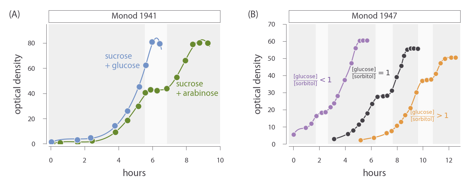 Nearly half a century later, Jacques Monod would rediscover the phenomenon of enzymatic adaptation, this time in the context of bacterial growth. In his 1941 work, Monod for the first time reported on the phenomenon of diauxic or biphasic growth, shown in Fig. 2 (A). He noted that for some mixtures of carbon sources, the culture grew “kinetically normal” meaning they grew exponentially to saturation (blue points, Fig. 2 (A)). However, some mixtures (such as sucrose and arabinose) led to biphasic growth where the culture would grow exponentially, undergo a period where growth had ceased (lasting typically 20 - 60 minutes), followed again by another round of exponential growth (green points, Fig. 2 (A)). Additionally, Monod showed that the onset of this diauxic shift could be tuned by varying the relative concentrations of the carbon sources, revealing a controllable chemical basis for the adaptation (Fig. 2 (B)).