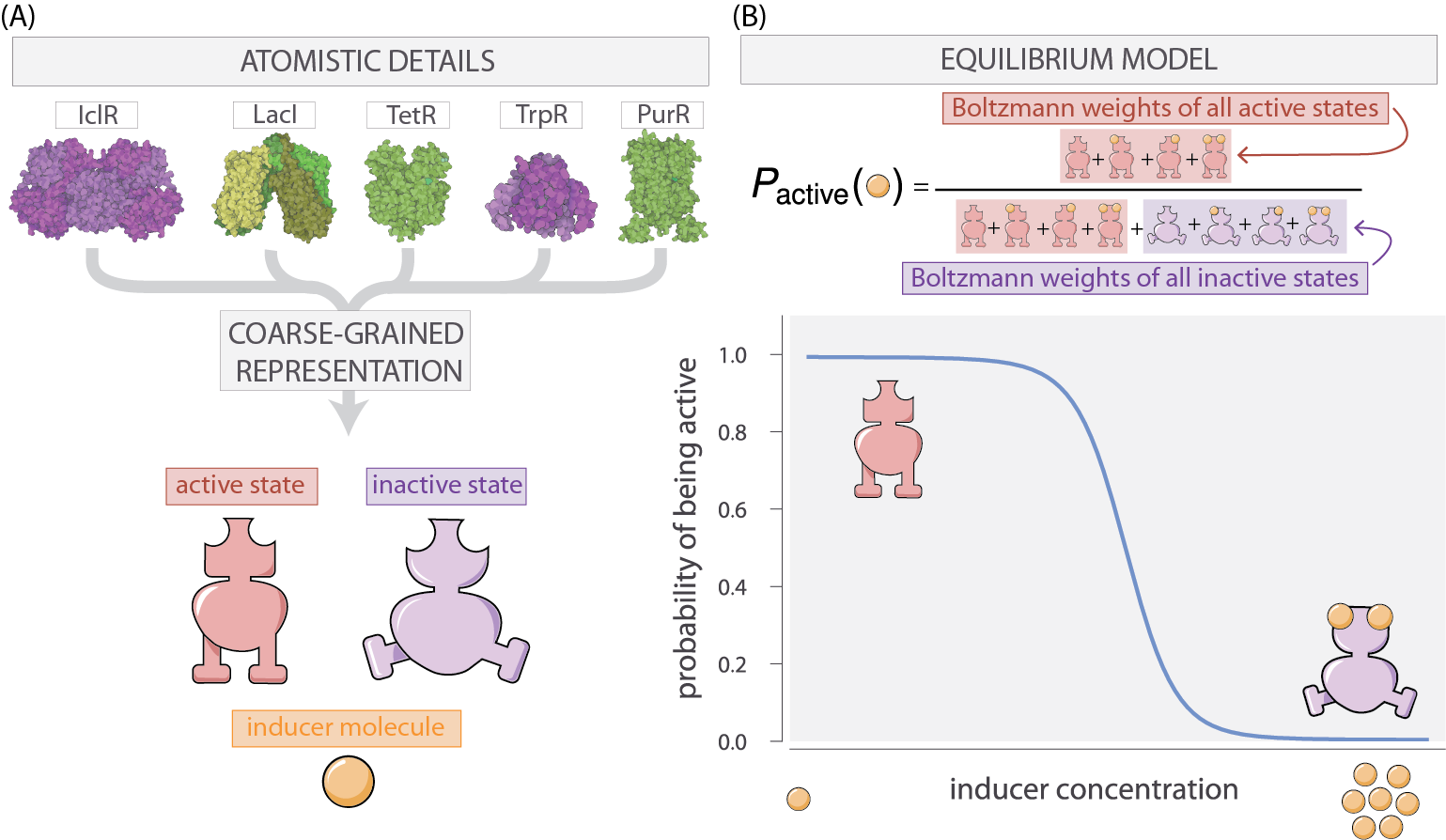 Monod is perhaps most famous for his discovery of allostery which he famously referred to as “the second secret of life” (Ullmann 2011; Monod, Wyman, and Changeux 1965). It is fair to say that this “secret” has now been declassified. Allosteric regulation is present in all domains of life across various types of biological processes. Allostery can be found governing the behavior of ion channels (Einav and Phillips 2017; Auerbach 2012), enzymatic reactions (Einav, Mazutis, and Phillips 2016), chemotaxis (Keymer et al. 2006), G-protein coupled receptors (Canals et al. 2012), quorum sensing (Swem et al. 2008), and transcriptional regulation (Huang et al. 2018; Lindsley and Rutter 2006), to name a few of many examples. Despite the objective complexity in the molecular structures of all of these allosteric molecules, they can frequently be reduced to simple cartoons where the details of conformational changes, substrate-binding affinities, and more can be massaged into a small set of key details. Fig. 3 (A) shows the molecular structures of a variety of allosteric transcriptional repressors (top). While each has its own fascinating structure and continuum of conformational states, all can be coarse grained into a simple cartoon representation (bottom) with an active (red) and inactive (purple) state, both of which possess binding pockets (semicircular notches) for an inducer molecule (orange).
