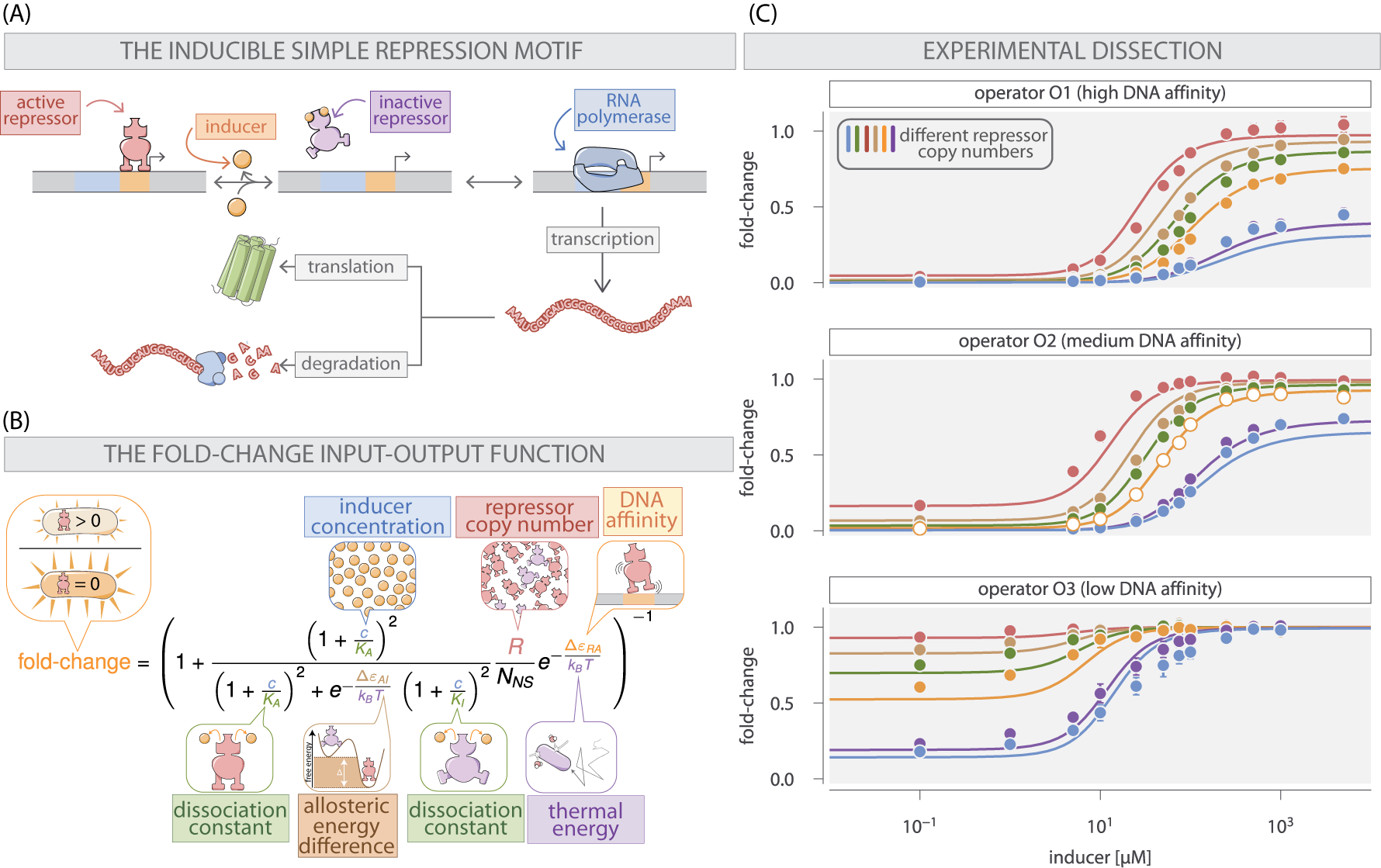 Together, we enumerated a complete thermodynamic model for the inducible simple repression motif and defined a succinct input-output function for the fold-change in gene expression (schematized in Fig. 4 (B)). Here, we define the fold-change in gene expression as the level of gene expression in the presence of a transcriptional repressor relative to the level of expression when the repressor is absent from the system. Therefore, the value of the fold-change is restricted from 0 to 1, corresponding to high and low levels of regulation respectively.