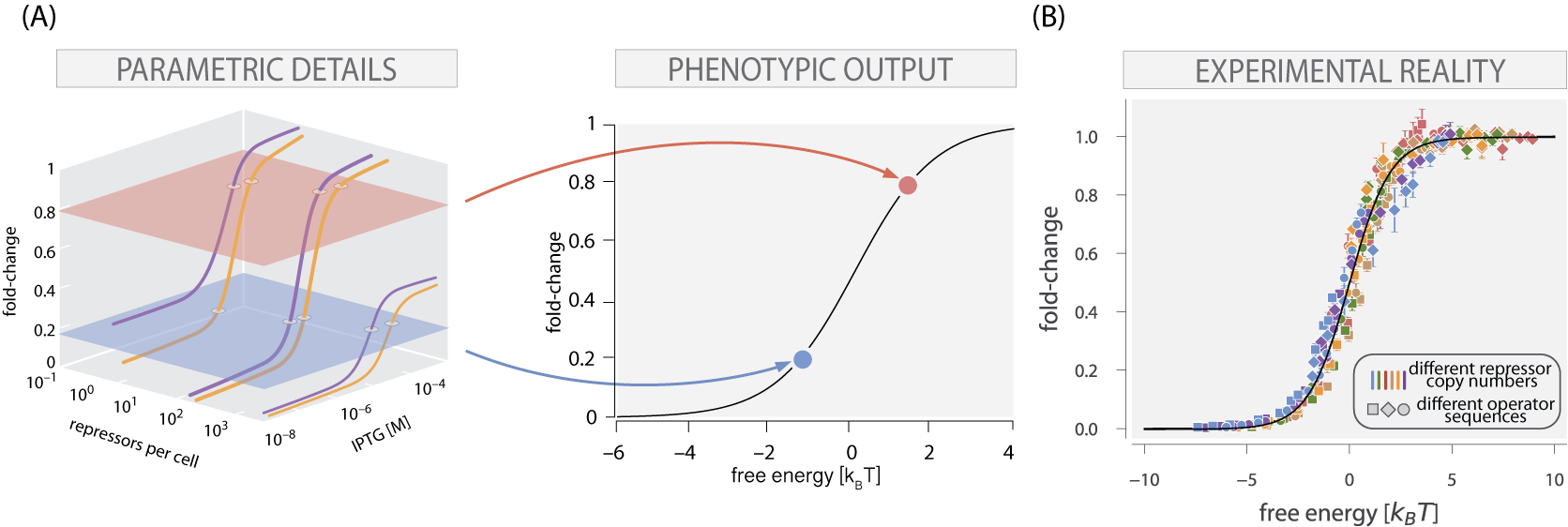 ch1_fig4.py) used to generate this figure can be accessed via the thesis GitHub repository.A key feature of this work is the derivation of thermodynamic state variable termed the free energy (Keymer et al. 2006; Swem et al. 2008). This parameter provides an intuition for the effective free energy difference between states of the promoter in which the repressor is bound and those states in which the repressor is not bound. This parameter accounts for all of the ways in which one can tune the variables and still achieve the same fold-change in gene expression, as is diagrammed in Fig. 5 (A). While we leave the details of this derivation to Chapter 2, we emphasize that this formalism provides a means by which all of the experimental measurements plotted in Fig. 4 (C) can be collapsed onto a master curve defined solely by the free energy, which is illustrated in Fig. 5 (B). This scaling, often referred to as “data collapse” in physics, concretely shows that one has identified the natural variable of the system. With this scaling function in hand, we are able to make a measurement of the biophysical parameters, compute the free energy, and make a concrete prediction of what the fold-change in gene expression will be. Or, as we will see in the following section, details of the biophysical parameters can be determined directly from an empirical measurement of the free energy.