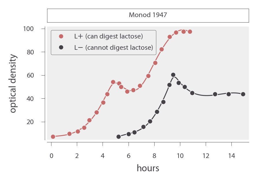Allow us to briefly return to Monod and his biphasic growth curves in the mid 1940s. At this point in scientific history, the French vision of biology had taken a strongly finalistic and vitalistic turn (Loison 2013). In particular, a neo-Lamarckian view had been employed to explain the phenomenon of enzymatic adaptation where the enzymes appropriate for digesting the substrate could be spontaneously formed out of the bacterial cytoplasm and inherited by the cell’s descendants, completely independent of genes. In general, this approach to biology deeply frustrated Monod and strongly influenced his desire to “physicalize” the science (Loison 2013). One tool he knew was critical to this mission was the burgeoning field of genetics. In the mid 1930s Monod undertook a short retreat to Thomas Hunt Morgan’s lab at Caltech where he was introduced to genetics which he later remarked as “biology’s first discipline” (Loison 2013). This visit had a profound impact on Monod, who reflected upon it some three decades later: