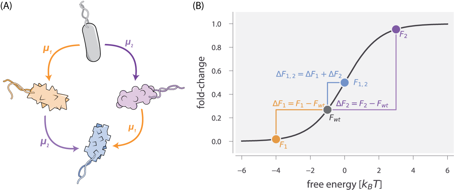 ch1_fig7.py) used to generate this figure can be accessed via the thesis GitHub repository. The primary conceptual development of Chapter 3 is illustrated in Fig. 7. Theoretically, we consider a bacterial strain with an allosteric repressor (which we term the “wild-type” repressor) that has been characterized well enough to have sufficient parametric knowledge of the system. We can use these known parameters of the mutant to easily compute both its predicted average fold-change in gene expression along with the corresponding free energy. However, once a mutation has been introduced into the repressor protein (resulting in a non-synonymous amino acid change), we are once again ignorant a priori of what changes, if any, that mutation may have imparted on the system. In Fig. 7, we examine two separate hypothetical mutations, shown in purple and orange, which significantly change the character of the system by either increasing or decreasing the fold-change in gene expression, respectively. If we assume that these mutations do not change the underlying physics of the system, we are permitted to use the theoretical framework outlined in Fig. 4 and elaborated on in Chapter 2 to characterize each mutation and determine what biophysical parameters have been changed. This framework allows us to calculate the new free energy of the system (Fmutation 1) as well as the shift in free energy from the wild-type value,