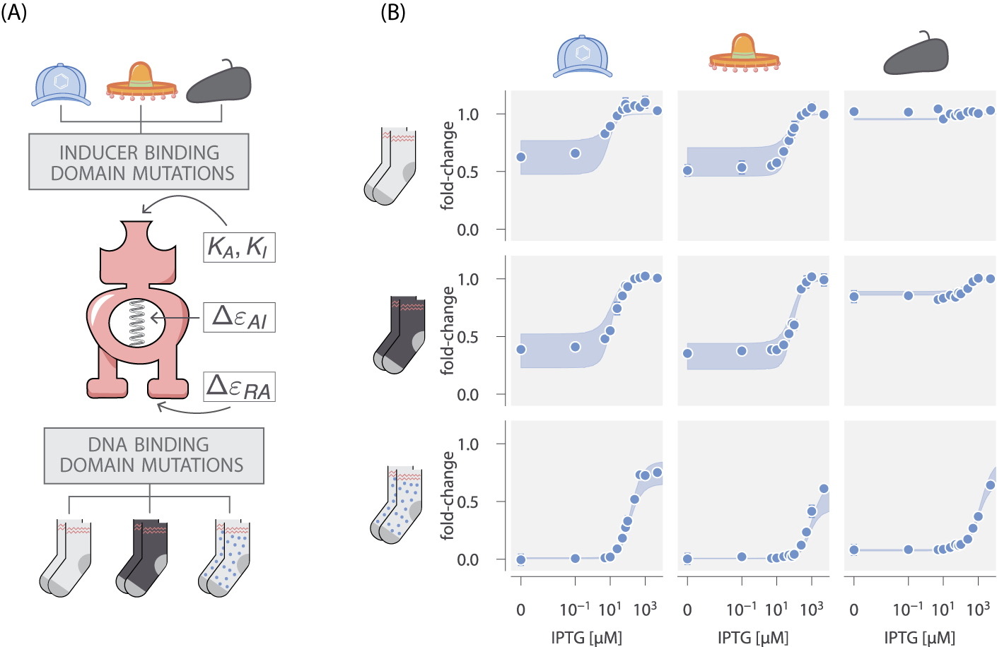 Over the course of two years (while this theory was in the works), the experimental cast of characters (Stephanie Barnes, Nathan Belliveau, Manuel Razo-Mejia, and Zofii Kaczmarek) and I made a series of mutations in the LacI repressor that we had characterized in the work presented in Chapter 2. These mutations included three point mutations in the DNA binding domain of the repressor, four mutations in the inducer-binding domain, nine double mutants (one inducer binding and one DNA binding each), across four repressor copy numbers and three operator sequences. While this process of strain generation and data collection is not the primary focus of the work, it took ≈ 80% of the effort. Without them, this work would have remained an untested theoretical novelty. While we leave many of the rich details of this prediction to the reader in Chapter 3, we showcase our experimental success in Fig. 8 (B) where the predicted induction profiles of nine double mutants (light blue shaded regions) are overlaid with their experimental measurements (points). The intimate agreement between theory and experiment illustrates the utility of using free energy shifts as a means to predict new phenotypes.