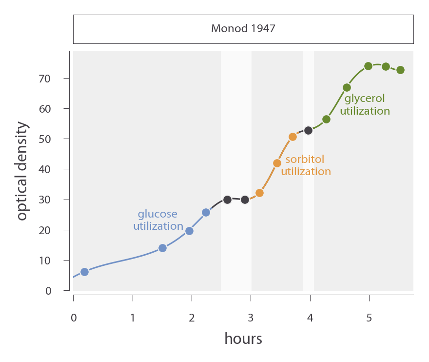 ch1_fig2.py) used to generate this figure can be accessed via the thesis GitHub repository.The diauxic growth transitions shown in Fig. 2 illustrate adaptive processes across the biological scales, as were schematized in Fig. 1. While it was not known to Monod at the time, we now know that many cases of enzymatic adaptation are driven by the regulation of gene expression. As the bacterial culture approaches the auxic shift, the presence or absence of the substrate is sensed by regulatory molecules that control whether the genes encoding the enzymes for metabolism of the substrate are expressed. This represents the level of molecular adaptation where, given binding or unbinding of the substrate molecule, the activity of the regulatory protein is modulated. The amino acid sequence of these proteinaceous regulators are the product of billions of years of evolution with regions of the protein (such as the DNA-binding and inducer-binding domains) undergoing evolutionary adaptation that define how the regulatory molecule senses and responds to these signals. Finally, the precision with which these genes are regulated is determined by their sensitivity to physiological states, capturing the level of physiological adaptation.