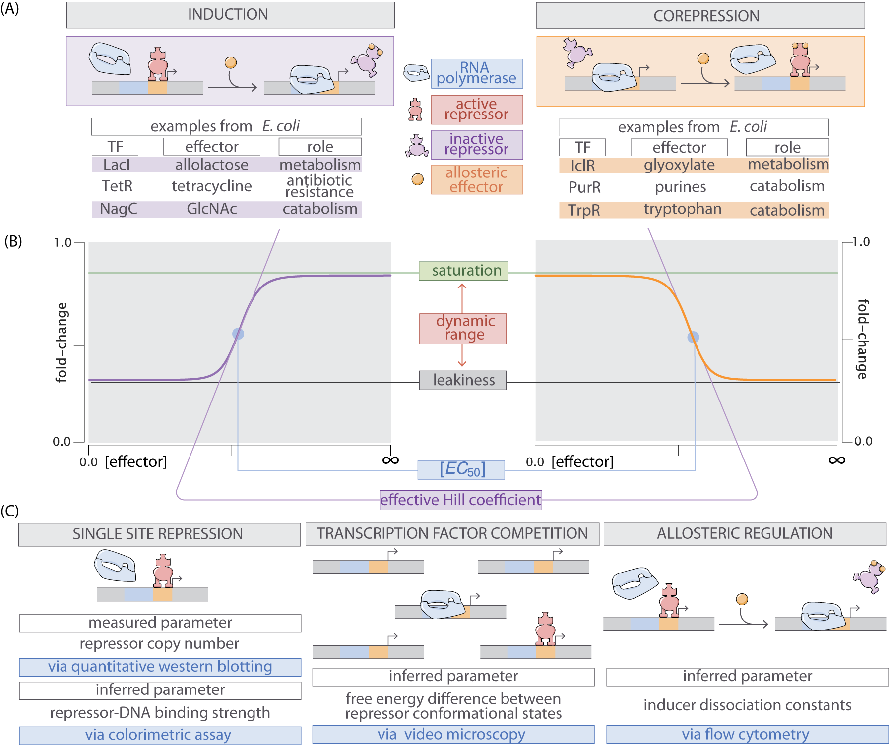 Despite the ubiquity of allostery, we largely lack a formal, rigorous, and generalizable framework for studying its effects across the broad variety of contexts in which it appears. A key example of this is transcriptional regulation, in which allosteric transcription factors can be induced or corepressed by binding to a ligand. An allosteric transcription factor can adopt multiple conformational states, each of which has its own affinity for the ligand and for its DNA target site. In vitro studies have rigorously quantified the equilibria of different conformational states for allosteric transcription factors and measured the affinities of these states to the ligand (Harman 2001; Lanfranco et al. 2017). In spite of these experimental observations, the lack of a coherent quantitative model for allosteric transcriptional regulation has made it impossible to predict the behavior of even a simple genetic circuit across a range of regulatory parameters, physiological states of the organism, and evolutionary isoforms of the regulatory sequences.