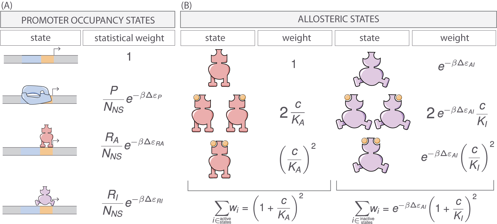 Thermodynamic models of gene expression begin by enumerating all possible states of the promoter and their corresponding statistical weights. As shown in Fig. 2 (A), the promoter can either be empty, occupied by RNAP, or occupied by either an active or inactive repressor. The probability of binding to the promoter will be affected by the protein copy number, which we denote as P for RNAP, RA for active repressor, and RI for inactive repressor. We note that repressors fluctuate between the active and inactive conformation in thermodynamic equilibrium, such that RA and RI will, on average, remain constant for a given inducer concentration (Monod, Wyman, and Changeux 1965). We assign the repressor a different DNA binding affinity in the active and inactive state. In addition to the specific binding sites at the promoter, we assume that there are NNS non-specific binding sites elsewhere (i.e. on parts of the genome outside the simple repression architecture) where the RNAP or the repressor can bind. All specific binding energies are measured relative to the average non-specific binding energy. Thus, ΔεP represents the energy difference between the specific and non-specific binding for RNAP to the DNA. Likewise, ΔεRA and ΔεRI represent the difference in specific and non-specific binding energies for repressor in the active or inactive state, respectively.
