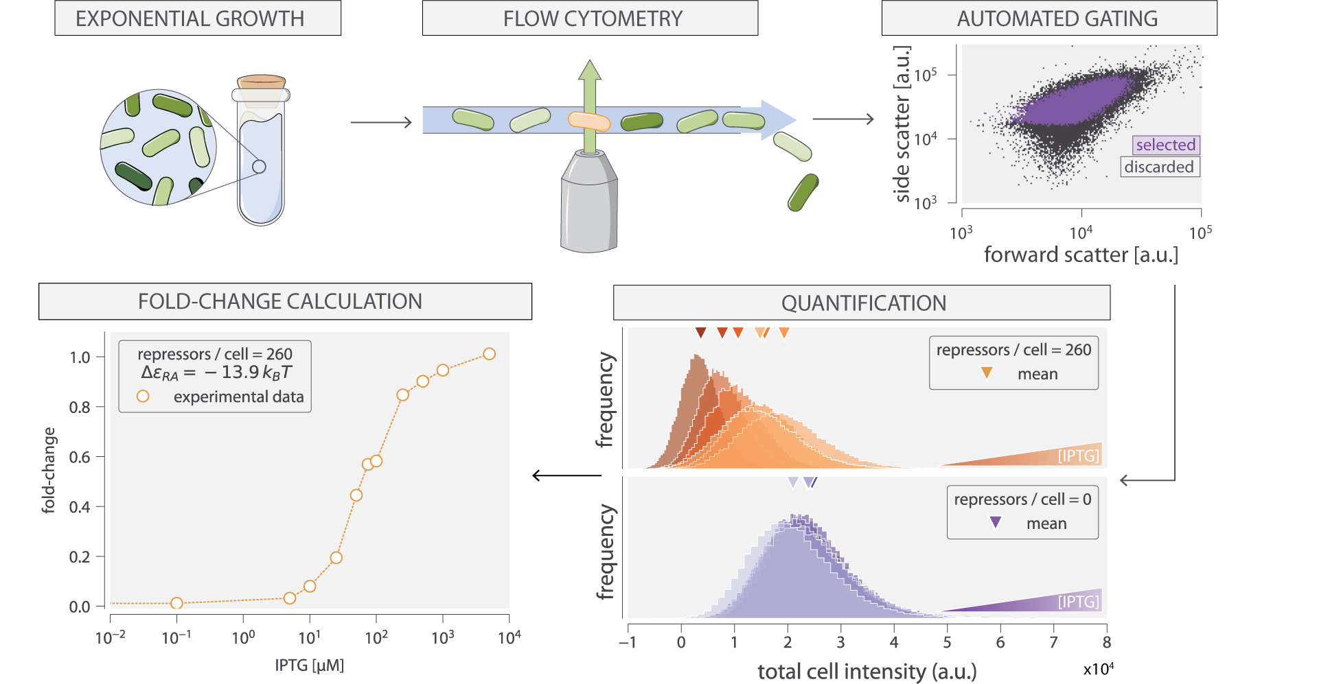 Our experimental pipeline for determining fold-change using flow cytometry is shown in Fig. 3. Briefly, cells were grown to exponential phase, in which gene expression reaches steady state (???), under concentrations of the inducer IPTG ranging between 0 and 5000 μM. We measure YFP fluorescence using flow cytometry and automatically gate the data to include only single-cell measurements (see Materials & Methods). To validate the use of flow cytometry, we also measured the fold-change of a subset of strains using the established method of single-cell microscopy (see supplemental Chapter 6). We found that the fold-change measurements obtained from microscopy were indistinguishable from that of flow-cytometry and yielded values for the inducer binding constants KA and KI that were within error.