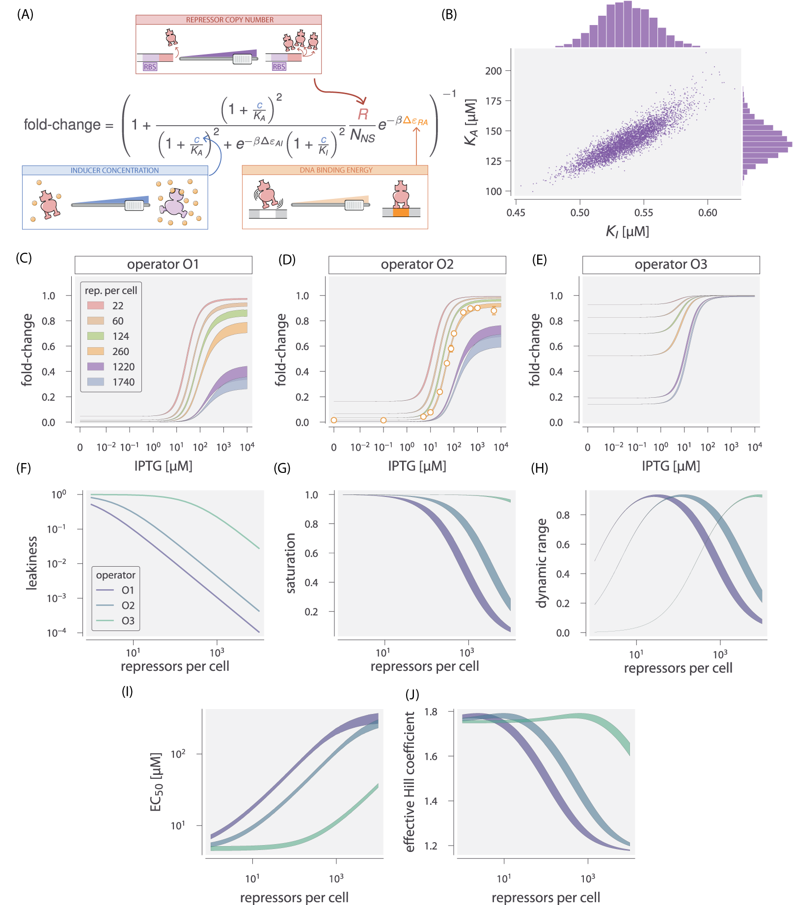 These three properties are shown in Fig. 4 (F-H). We discuss these properties in greater detail in supplemental Chapter 6. Fig. 6 shows that the measurements of these three properties, derived from the fold-change data in the absence of IPTG and the presence of saturating IPTG, closely match the predictions for all three operators.