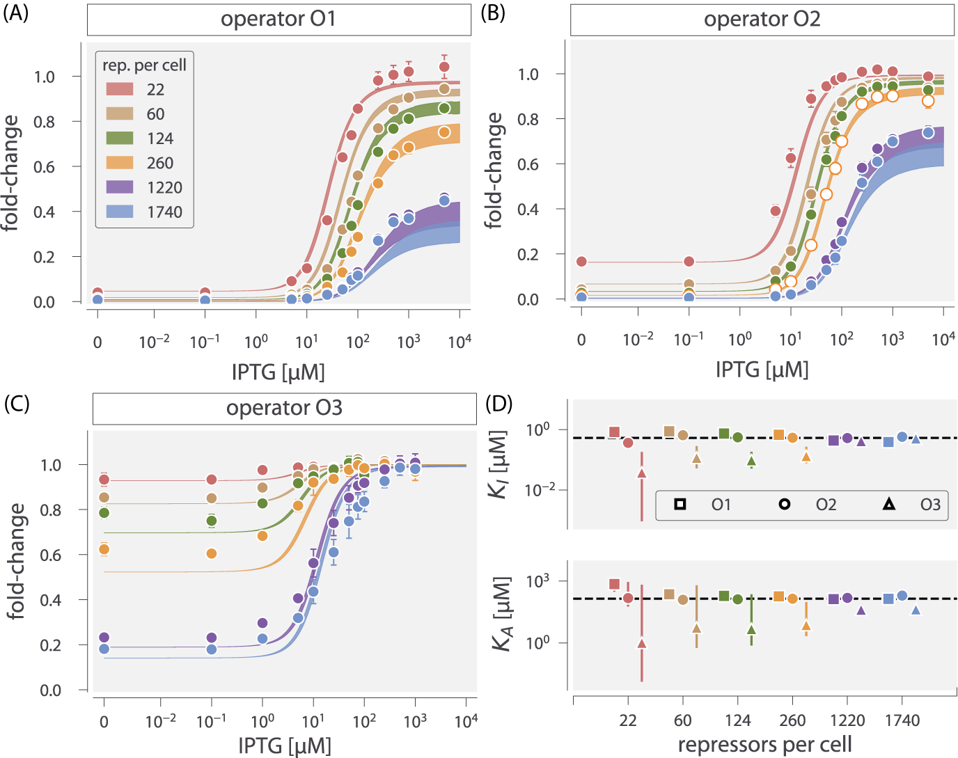 We determine the values of KA and KI by fitting to a single induction profile using Bayesian inferential methods (Sivia and Skilling 2006). We then use Eq. 5 to predict gene expression for any concentration of inducer, repressor copy number, and DNA binding energy, and compare these predictions against experimental measurements. To obtain induction profiles for a set of strains with varying repressor copy numbers, we used modified lacI ribosomal binding sites from Garcia et al. (2011a) to generate strains with repressor copy number of R = 22 ± 4, 60 ± 20, 124 ± 30, 260 ± 40, 1220 ± 160, and 1740 ± 340 per cell on average, where the error denotes standard deviation of at least three replicates as measured by Garcia et al. (2011a). We note that R refers to the number of repressor dimers in the cell, which is twice the number of repressor tetramers reported by Garcia et al. (2011a); since both heads of the repressor are assumed to always be either specifically or non-specifically bound to the genome, the two repressor dimers in each LacI tetramer can be considered independently. Gene expression was measured using a Yellow Fluorescent Protein (YFP) gene, driven by a lacUV5 promoter. Each of the six repressor copy number variants were paired with the native O1, O2, or O3 lac operator (Oehler et al. 1994) placed at the YFP transcription start site, thereby generating eighteen unique strains. The repressor-operator binding energies (O1 ΔεRA = − 15.3 ± 0.2 kBT, O2 ΔεRA = − 13.9 kBT ± 0.2, and O3 ΔεRA = − 9.7 ± 0.1 kBT) were previously inferred by measuring the fold-change of the lac system at different repressor copy numbers, where the error arises from model fitting (Garcia et al. 2011a). Additionally, we were able to obtain the value ΔεAI = 4.5 kBT by fitting to previous data as discussed in the Materials & Methods. We measure fold-change over a range of known IPTG concentrations c, using n = 2 inducer binding sites per LacI dimer and approximating the number of non-specific binding sites as the length in base-pairs of the E. coli genome, NNS = 4.6 × 106.