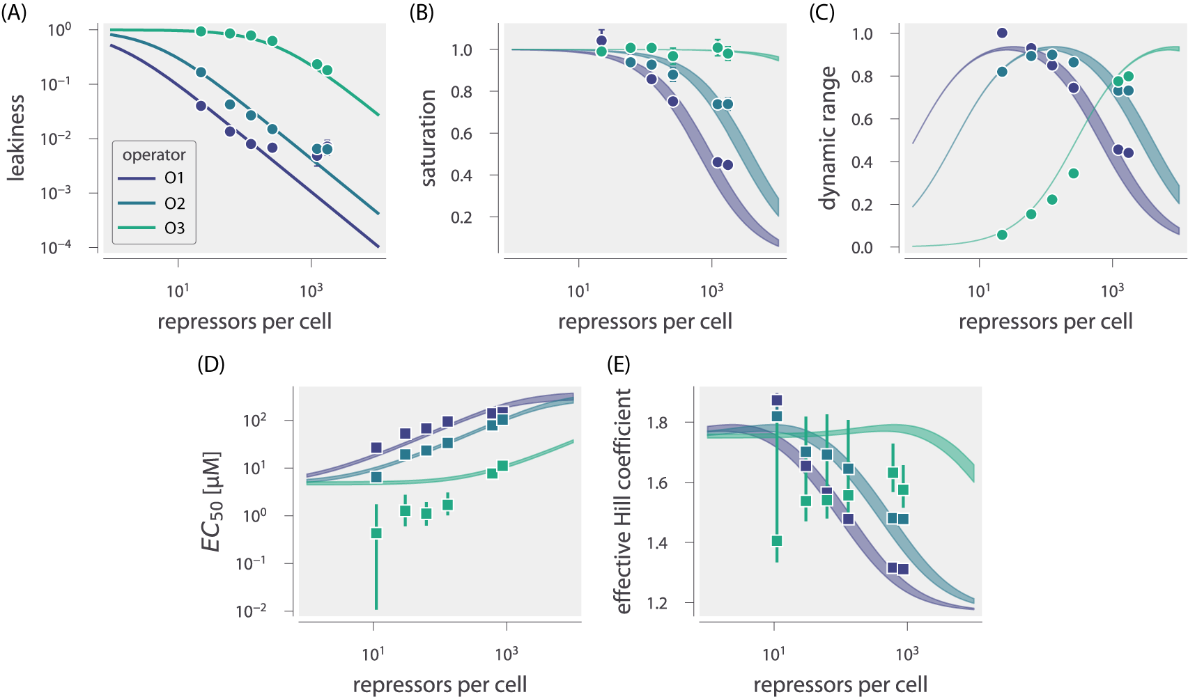 Fig. 6 (D–E) shows how the [EC50] and effective Hill coefficient depend on the repressor copy number. In supplemental Chapter 6, we discuss the analytic forms of these two properties as well as their dependence on the repressor-DNA binding energy. Fig. 6 (D-E) shows the estimated values of the [EC50] and the effective Hill coefficient overlaid on the theoretical predictions. Both properties were obtained by fitting to each individual titration curve and computing the [EC50] and effective Hill coefficient. We find that the predictions made with the single strain closely match those made for each of the strains with O1 and O2 operators, but the predictions for the O3 operator are markedly off. In the supplemental Chapter 6, we show that the large, asymmetric error bars for the O3 R = 22 strain arise from its nearly flat response, where the lack of dynamic range makes it impossible to determine the value of the inducer dissociation constants KA and KI, as can be seen in the uncertainty of both the [EC50] and effective Hill coefficient. Discrepancies between theory and data for O3 are improved, but not fully resolved, by performing a global fit or fitting the MWC model individually to each curve (see supplemental Chapter 6). It remains an open question how to account for discrepancies in O3, in particular regarding the significant mismatch between the predicted and fitted effective Hill coefficients.