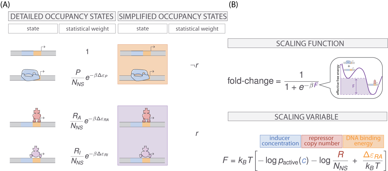 The equilibrium states and statistical weights outlined in Fig. 2 (A) can be further coarse grained into two possible states – one state being where the promoter is occupied by the repressor and another being where the promoter is not occupied by the repressor (Fig. 7 (A)). As the transcriptionally active state and the states in which the repressor is bound are mutually exclusive, we can compute the probability of the repressor not being bound p¬r to the promoter as