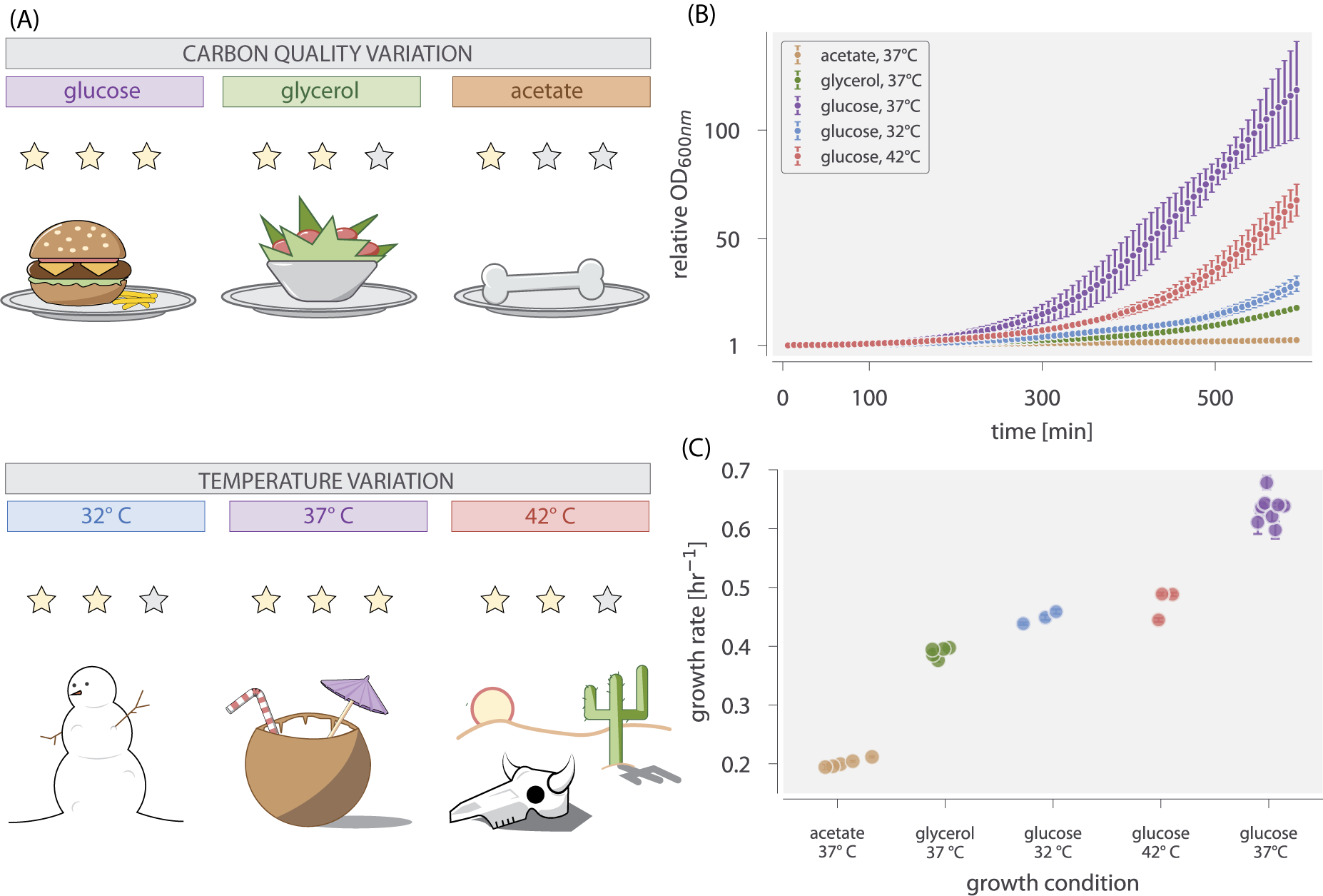 We modulated growth of Escherichia coli by varying either the quality of the available carbon source (differing ATP yield per C atom) or the temperature of the growth medium (Fig. 1 (A)). All experiments were performed in a defined M9 minimal medium supplemented with one of three carbon sources – glucose, glycerol, or acetate – at concentrations such that the total number of carbon atoms available to the culture remained the same. These carbon sources have been shown to drastically alter growth rate and gene expression profiles, indicating changes in the proteomic composition and distinct physiological states. These carbon sources yield an approximate four-fold modulation of the growth rate with doubling times ranging from ≈ 220 minutes to ≈ 65 minutes in an acetate or glucose supplemented medium, respectively Fig. 1 (B) and (C). While the growth temperature was varied over 10∘ C, both 32∘ and 42∘ C result in approximately the same doubling time of ≈ 90 min, which is 1.5 times slower than the optimal temperature of 37∘ C (Fig. 1 (B) and (C)).