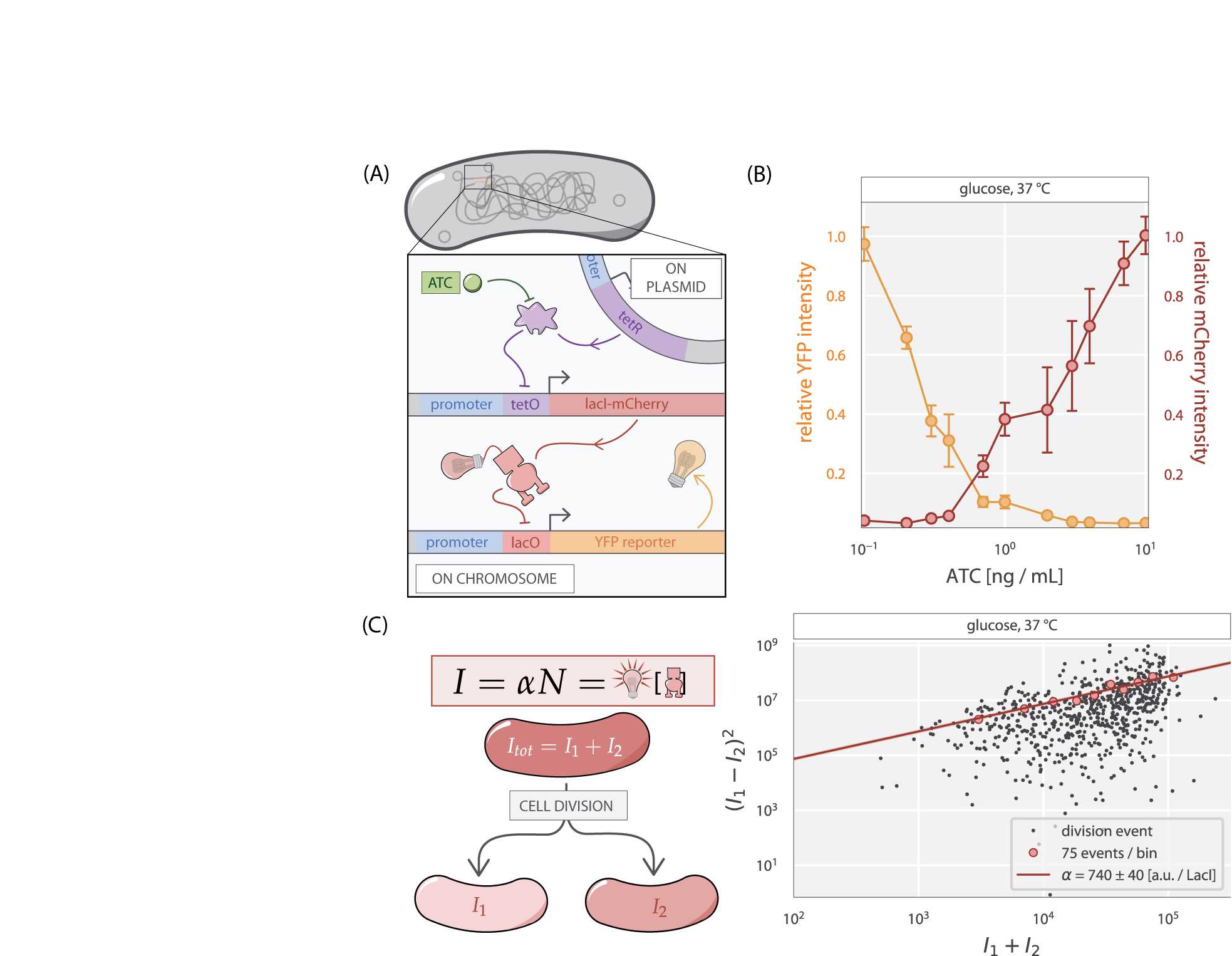 While the mCherry fluorescence is proportional to the repressor copy number, it is not a direct measurement as the fluorescence of a single LacI-mCherry dimer is unknown a priori. Using video microscopy, we measure the partitioning statistics of the fluorescence intensity into two sibling cells after division (Fig. 2 (C)). This method, described in detail in the Materials & Methods as well as in Rosenfeld, Elowitz, and Alon (2002), Rosenfeld et al. (2005), and Brewster et al. (2014), reveals a linear relationship between the variance in intensity between two sibling cells and the intensity of the parent cell, the slope of which is equal to the brightness of a single LacI repressor. Since this measurement is performed simultaneously with measurement of the expression of the YFP reporter, this calibration factor was determined for each unique experimental replicate. We direct the reader to the supplemental Chapter 8 for a more thorough discussion of this inference.