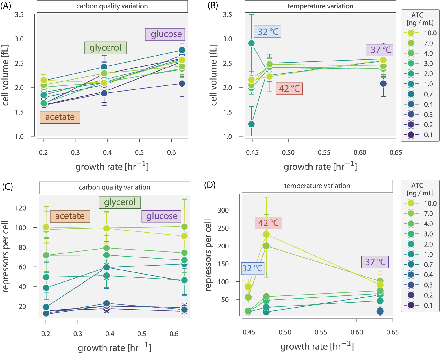 Given the single-cell resolution of our experimental method, we examined how the cell volume and repressor copy number scaled across the different growth conditions at different levels of ATC induction. In agreement with the literature (Schaechter, Maaløe, and Kjeldgaard 1958; Jun et al. 2018; Shehata and Marr 1975), our measurement reveals a strong linear dependence of the cell volume on the choice of carbon source, but no significant dependence on temperature (Fig. 3 (A) and (B)). Additionally, these findings are consistent across different ATC induction regimes. Together, these observations confirm that the particular details of our experimental system does not introduce unintended physiological consequences.
