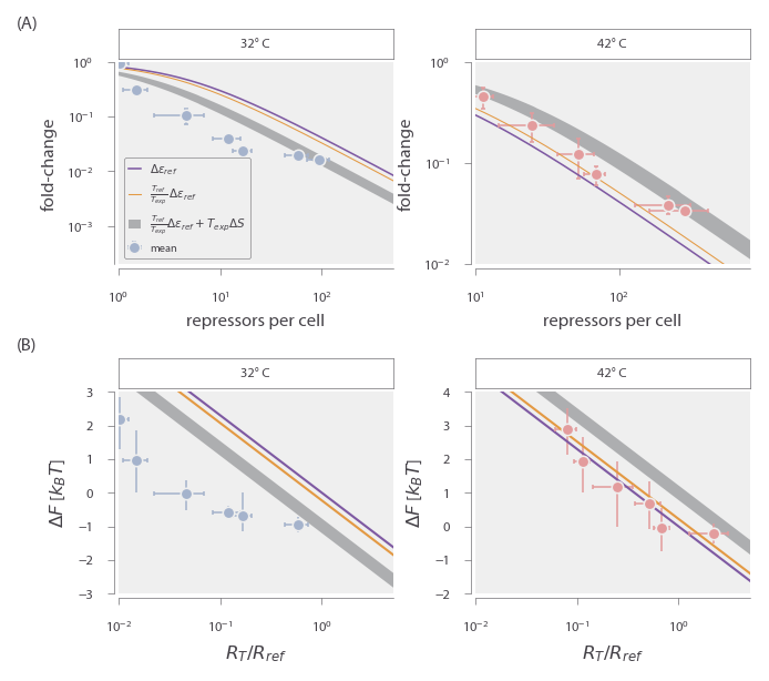 Fig. 4 (A) shows the measured fold-change in gene expression (points) plotted against the theoretical prediction with this correction factor (orange line). It is immediately evident that a simple rescaling of the energetic parameters is not sufficient for the 32∘ C condition and slightly underestimates the fold-change in the 42∘ C condition. To identify the source of this disagreement, we can again examine the free energy shift ΔF. As both ΔεAI and ΔεR are scaled to the thermal energy, ΔF defined as FT − Fref can be directly calculated as