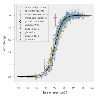 The effective free energy F, as defined in Eq. ¿eq:growth_bohr_parameter?, is a state variable of the simple repression regulatory architecture. This is illustrated in Fig. 5 where fold-change measurements from a wide array of conditions (and measurement techniques) can be collapsed onto the same theoretical description. Evolutionary perturbations (such as mutations in the operator or repressor sequence), physiological changes (such as modulations of the growth rate), or changes in the level of activity of the repressor (due to changes in inducer concentration) do not change the fundamental physics of the system and can all be described by changes in the free energy relative to one another. While such a statement is not “surprising,” we can now say it with quantitative confidence and use this principle to probe the degree to which physiological perturbations influence the biophysical parameters writ large. With such a framework in hand, we are in the auspicious position to take a predictive approach towards understanding how this regulatory architecture evolves in experimental settings, shedding light on the interplay between biophysical parameters, organismal fitness, and the fundamental forces of evolution.