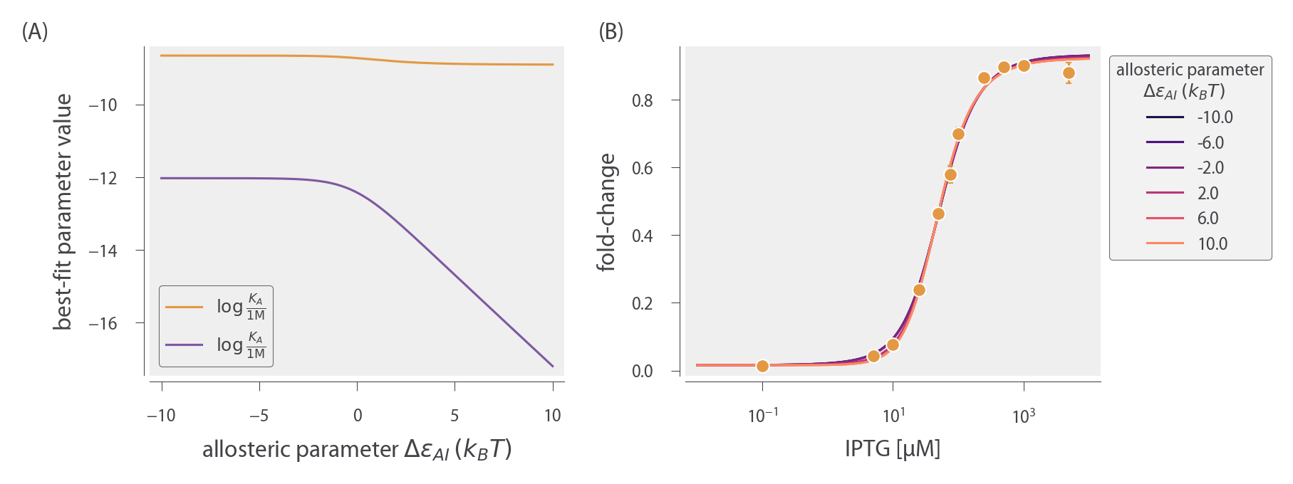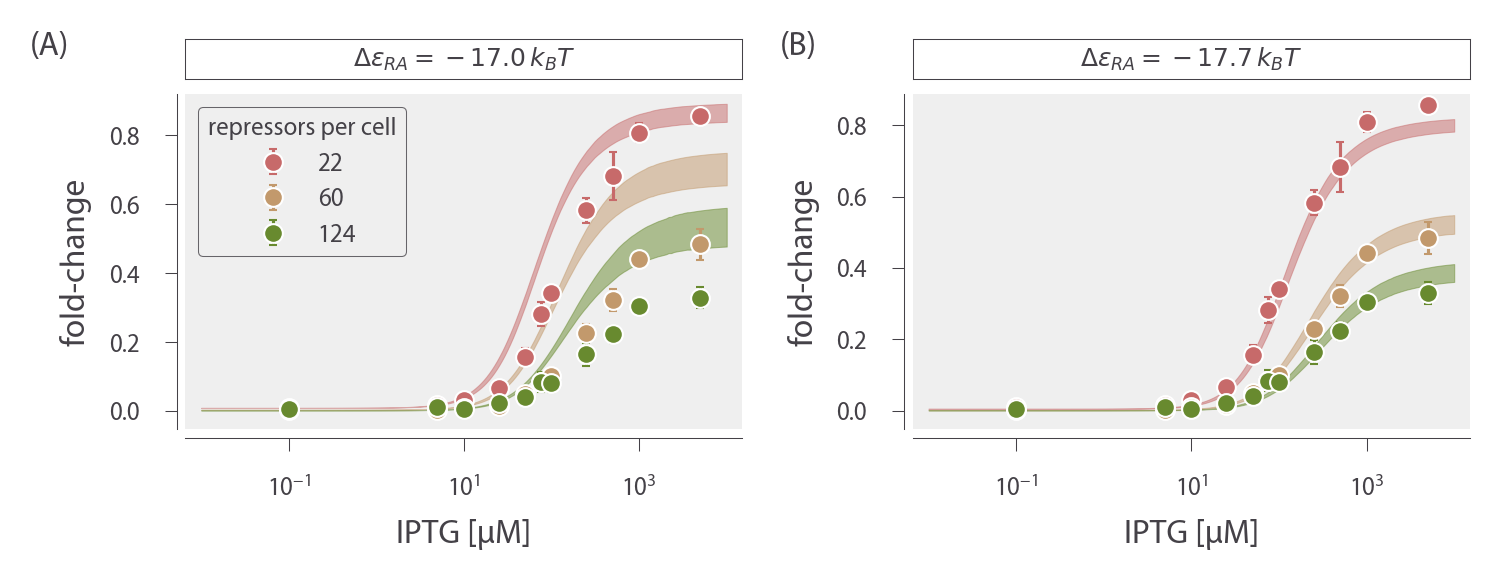 The best-fit curves for several different values of ΔεAI are shown in Fig. 1 (B). Note that these fold-change curves are nearly overlapping, demonstrating that different sets of parameters can yield nearly equivalent responses. Without more data, the relationships between the parameter values represent the maximum information about the parameter values that can be extracted from the data. Additional experiments which independently measure any of these unknown parameters could resolve this degeneracy. For example, NMR measurements could be used to directly measure the fraction (1 + e − βΔεAI) − 1 of active repressors in the absence of IPTG (Gardino et al. 2003; Boulton and Melacini 2016).