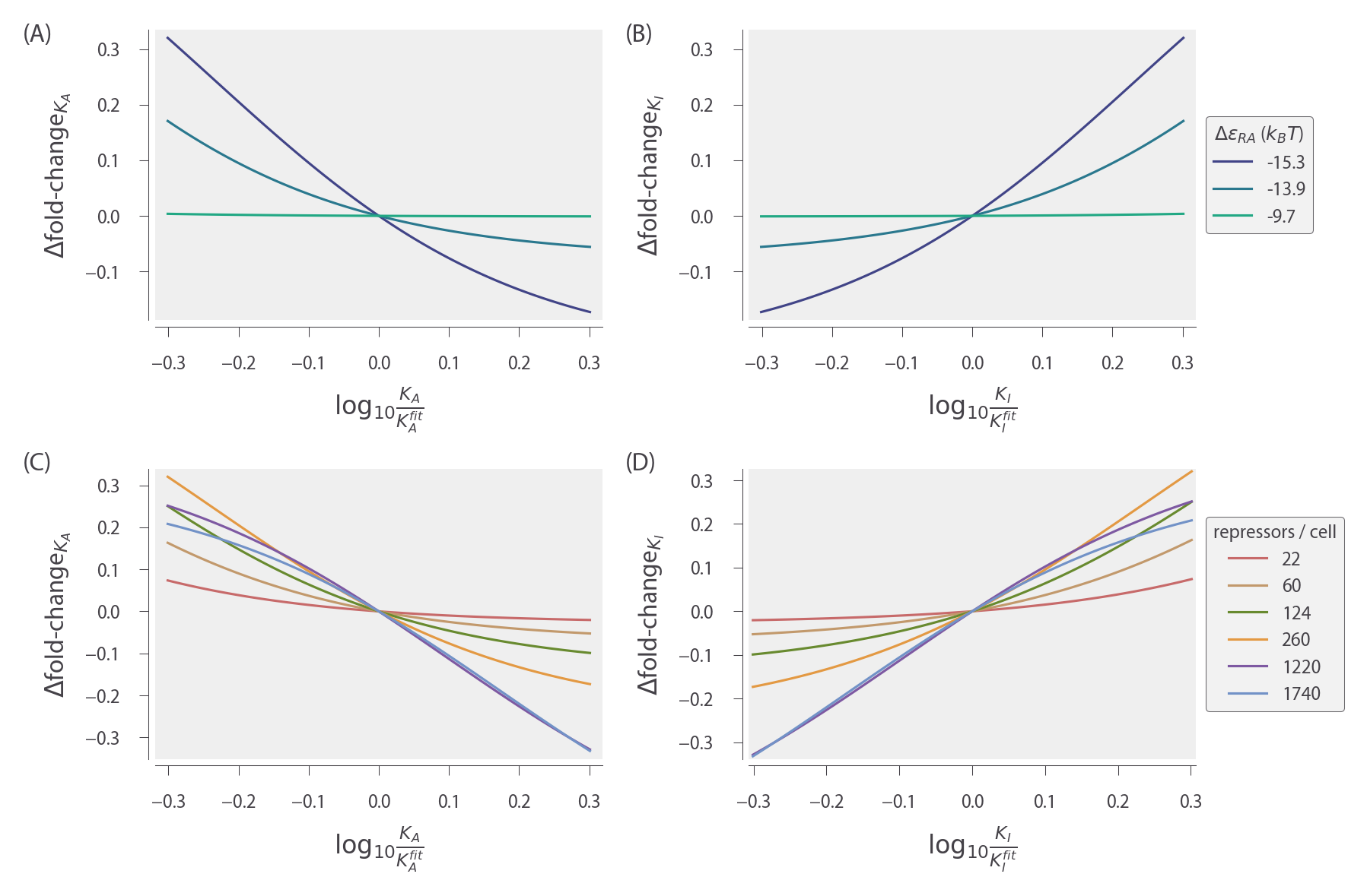 where c now represents the concentration of the corepressor molecule. Mathematically, the difference between these two architectures can be seen in the relative sizes of the dissociation constants KA and KI between the inducer and repressor in the active and inactive states, respectively. The corepressor is defined by KA < KI, since the corepressor favors binding to the repressor’s active state; an inducer must satisfy KI < KA, as was found in Chapter 2. Much as was performed in Chapter 2, we can make some predictions regarding the response of a corepressor. In Fig. 20 (A), we show how varying the repressor copy number R and the repressor-DNA binding energy ΔεRA influence the response. We draw the reader’s attention to the decrease in fold-change as the concentration of effector is increased.