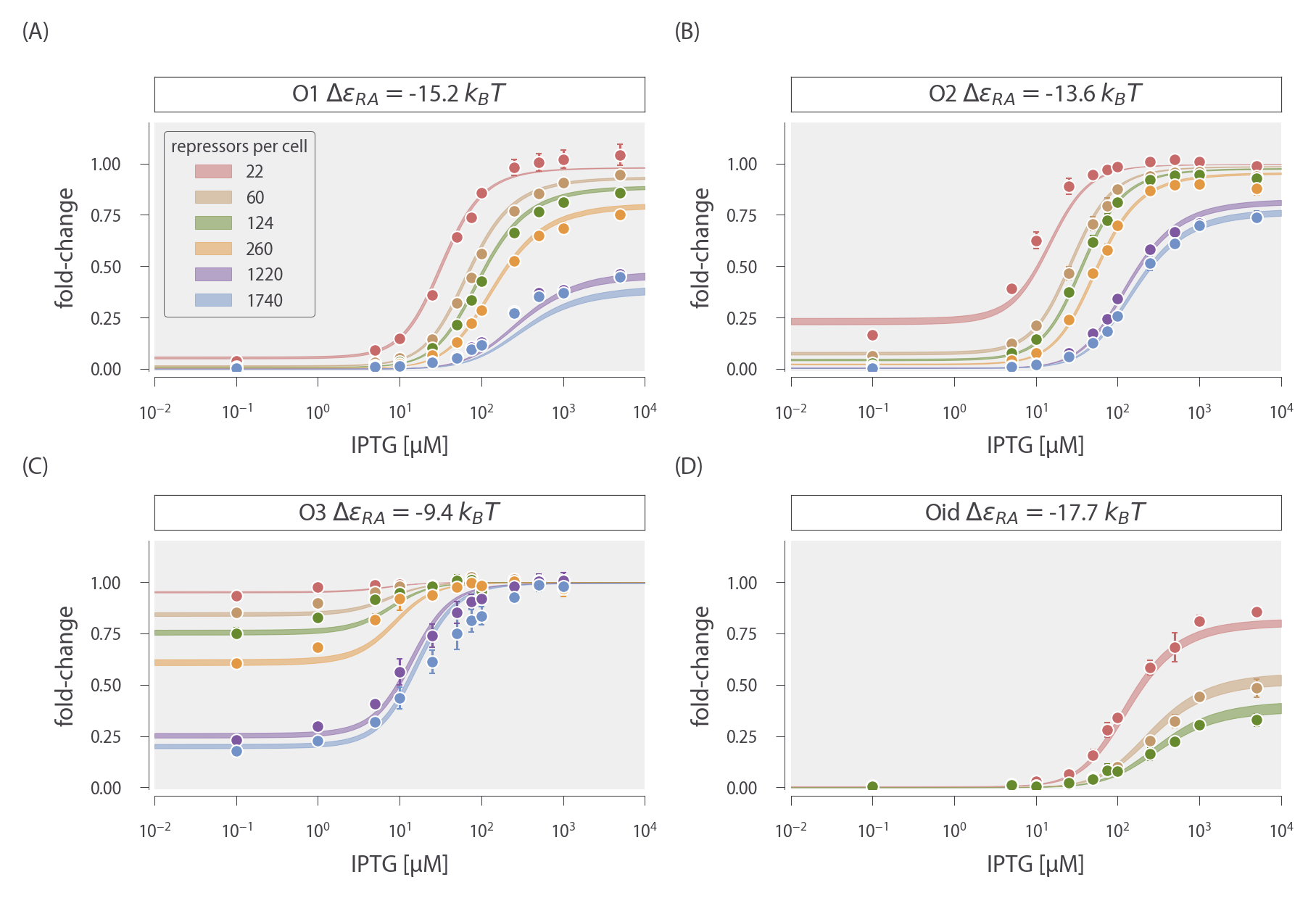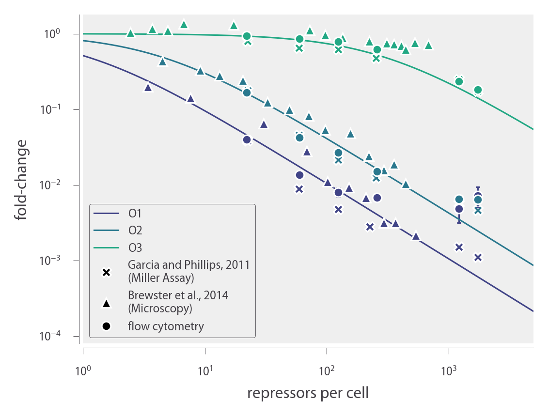 Garcia and Phillips determined the total repressor copy numbers R of different strains using quantitative Western blots. Then they measured the fold-change at these repressor copy numbers for simple repression constructs carrying the O1, O2, O3, and Oid lac operators integrated into the chromosome. These data were then fit to the following thermodynamic model to determine the repressor-DNA binding energies Δε̃RA for each operator,