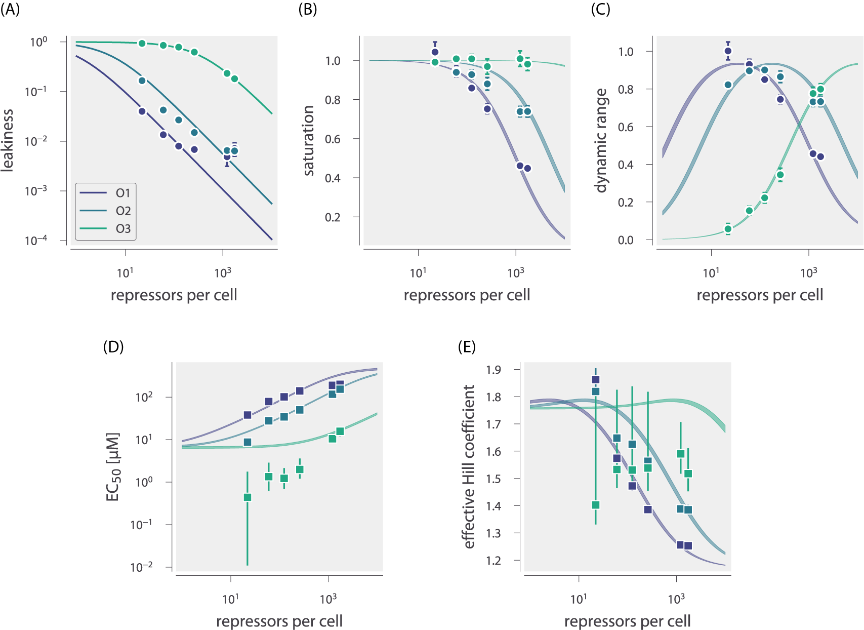 In Fig. 6, we show how the leakiness, saturation, and dynamic range vary with R and ΔεRA in systems with NS = 10 or NS = 100. An inflection point occurs where NS = R, with leakiness and dynamic range behaving differently when R < NS than when R > NS. This transition is more dramatic for NS = 100 than for NS = 10. Interestingly, the saturation values consistently approach 1, indicating that full induction is easier to achieve when multiple specific sites are present. Moreover, dynamic range values for O1 and O2 strains with ΔεRA = − 15.3 and − 13.9 kBT approach 1 when R > NS, although when NS = 10, there is a slight downward dip owing to saturation values of less than 1 at high repressor copy numbers.