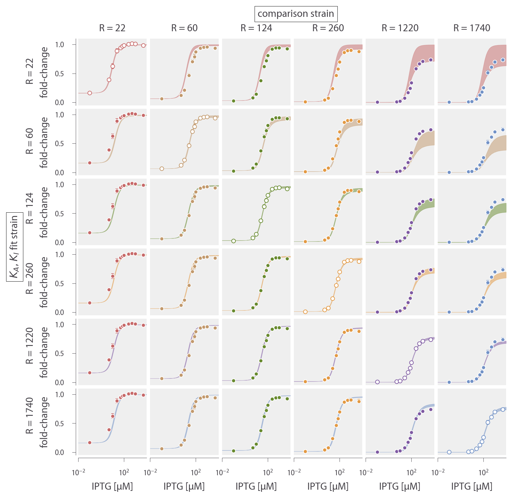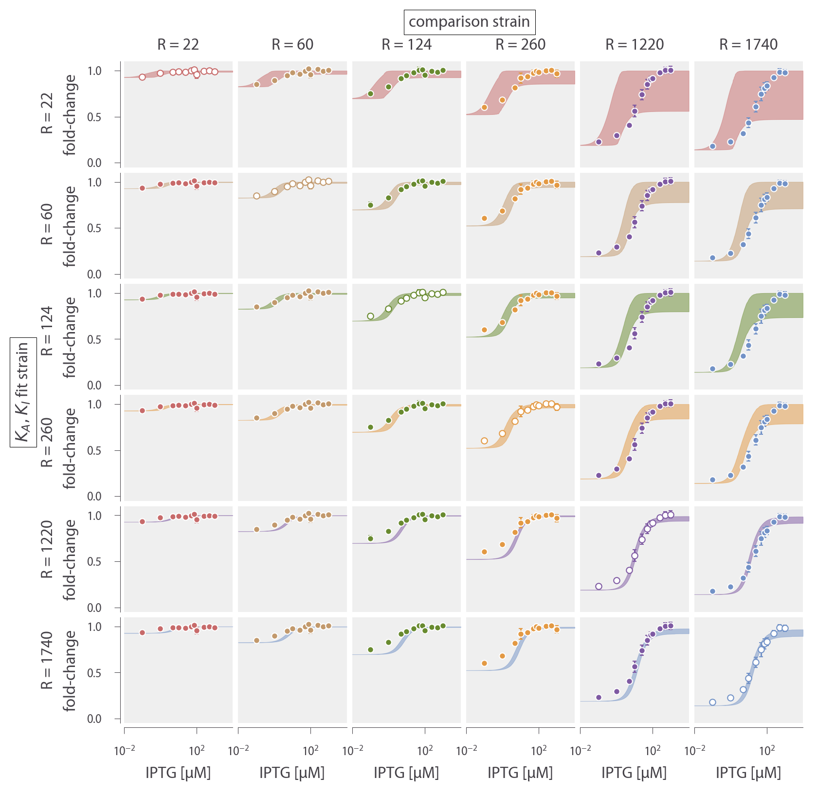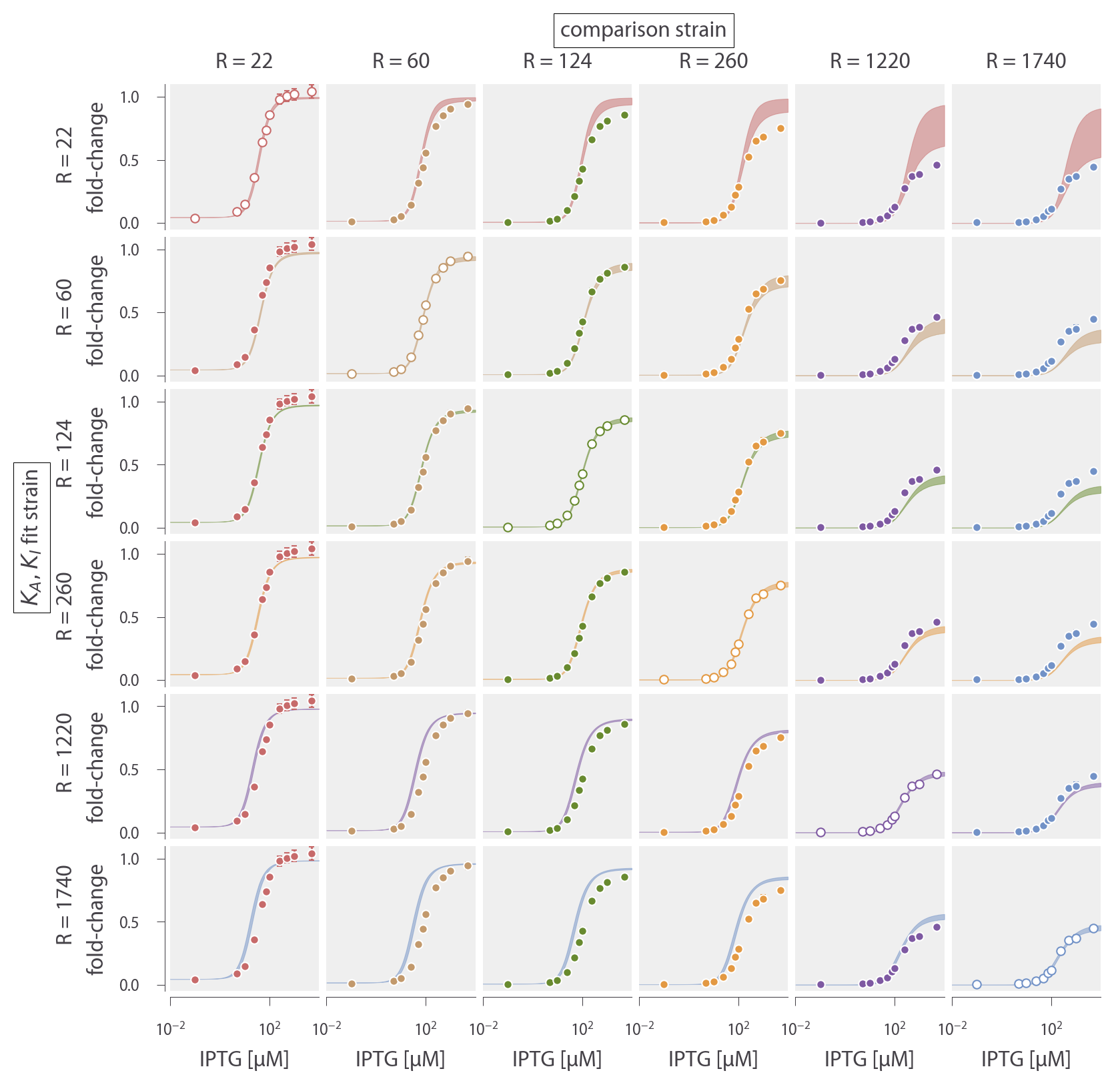 In Fig. 1 we fit the R = 260 data by fixing ΔεAI to the value shown on the x-axis and determine the parameters KA and KI given this constraint. We use the fold-change function, but with βΔεRA modified to the form βΔε̃RA to account for the underlying assumptions used when fitting previous data (as is defined in the following section).