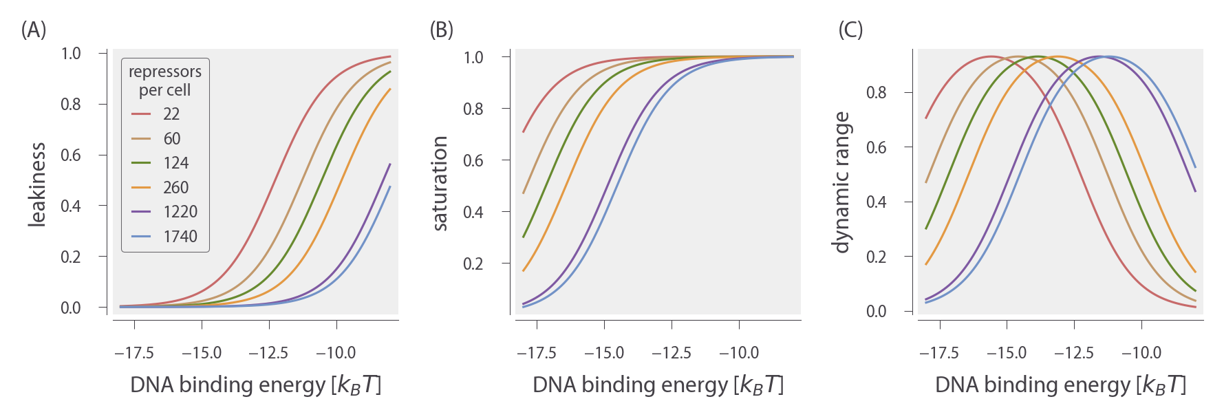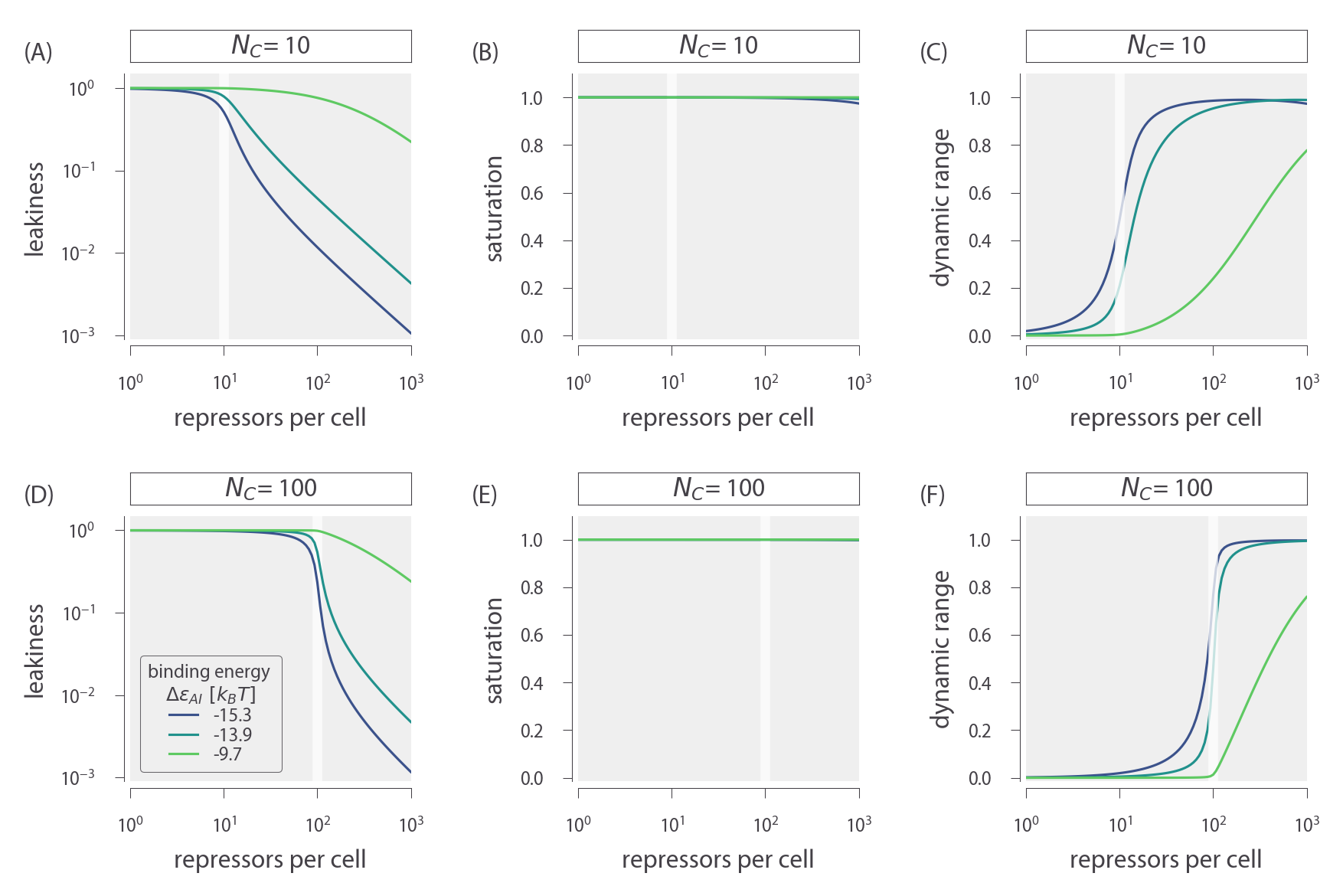 ch6_figS6.py) used to generate this figure can be found on the thesis GitHub repository.In Fig. 7, we similarly show how the leakiness, saturation, and dynamic range vary with R and ΔεRA in systems with NS = 1 and multiple competitor sites NC = 10 or NC = 100. Each of the competitor sites has a binding energy of ΔεC = − 17.0 kBT. The phenotypic profiles are very similar to those for multiple specific sites with sharper transitions at R = NC due to the greater binding strength of the competitor site. This indicates that introducing competitors has much the same effect on the induction phenotypes as introducing additional specific sites, as in either case the influence of the repressors is dampened when there are insufficient repressors to interact with all of the specific binding sites.