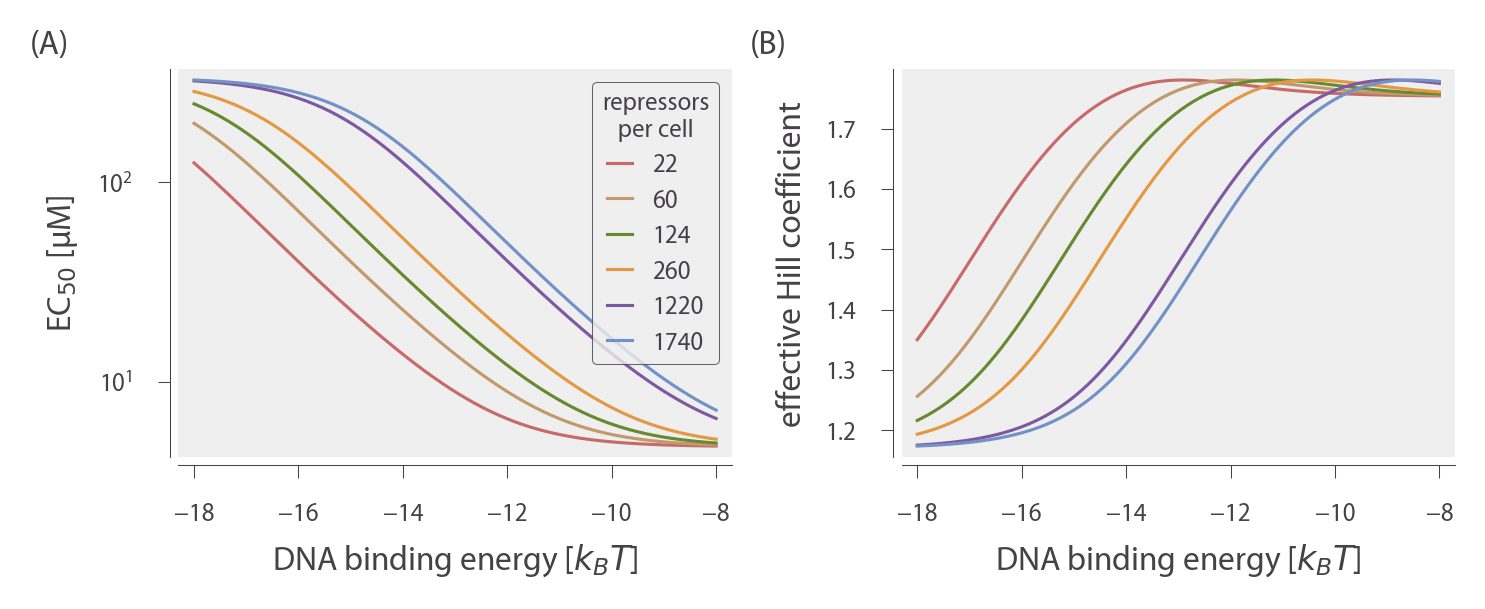 Using this expression, we can then find the effective Hill coefficient h, which equals twice the log-log slope of the normalized fold-change evaluated at c = [EC50]. In Fig. 2.7 (D-E), we show how these two properties vary with repressor copy number, and in Fig. 19, we demonstrate how they depend on the repressor-operator binding energy. Both the [EC50] and h vary significantly with repressor copy number for sufficiently strong operator binding energies. Interestingly, for weak operator binding energies on the order of the O3 operator, it is predicted that the effective Hill coefficient should not vary with repressor copy number. In addition, the maximum possible Hill coefficient is roughly 1.75, which stresses the point that the effective Hill coefficient should not be interpreted as the number of inducer binding sites, which is exactly 2.