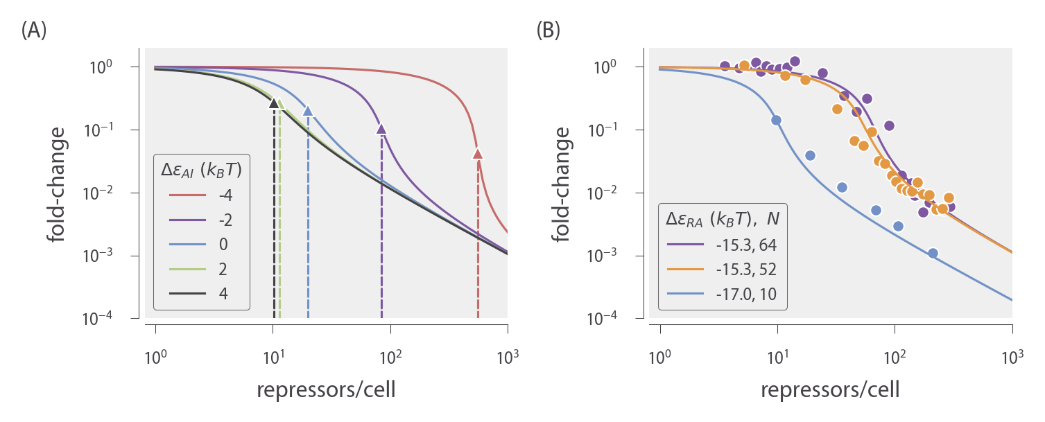 With these calculations in hand, we can now determine the value of the ΔεAI parameter. Fig. 2 shows how different values of ΔεAI lead to significantly different fold-change response curves. Thus, analyzing the specific fold-change response of any strain with a known plasmid copy number N will fix ΔεAI. Interestingly, the inflection point occurs near pA(0)Rtot = N (as shown by the triangles in Fig. 2), so that merely knowing where the fold-change response transitions from concave down to concave up is sufficient to obtain a rough value for ΔεAI. We note, however, that for ΔεAI ≥ 5 kBT, increasing ΔεAI further does not affect the fold-change because essentially every repressor will be in the active state in this regime. Thus, if the ΔεAI is in this regime, we can only bound it from below.