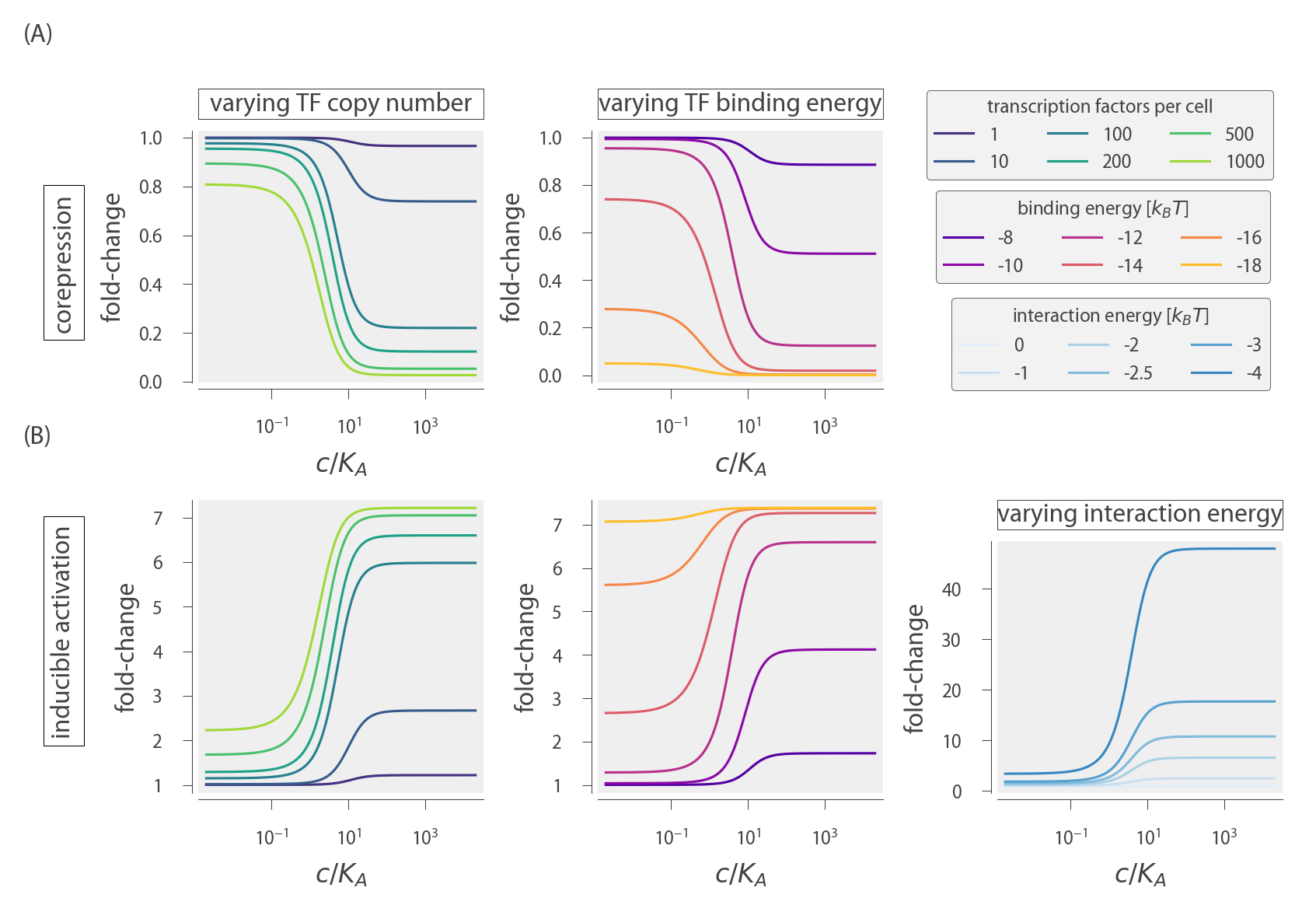 where A is the total number of activators per cell, c is the concentration of a coactivator molecule, ΔεAA is the binding energy of the activator to the DNA in the active allosteric state, and εAP is the interaction energy between the activator and the RNAP. Unlike in the cases of induction and corepression, the fold-change formula for activation includes terms from when the RNAP is bound by itself on the DNA as well as when both RNAP and the activator are simultaneously bound to the DNA. Fig. 20 (B) explores predictions of the fold-change in gene expression by manipulating the activator copy number, DNA binding energy, and the polymerase-activator interaction energy. Note that with this activation scheme, the fold-change must necessarily be greater than one. An interesting feature of these predictions is the observation that even small changes in the interaction energy ( < 0.5 kBT) can result in dramatic increase in fold-change.