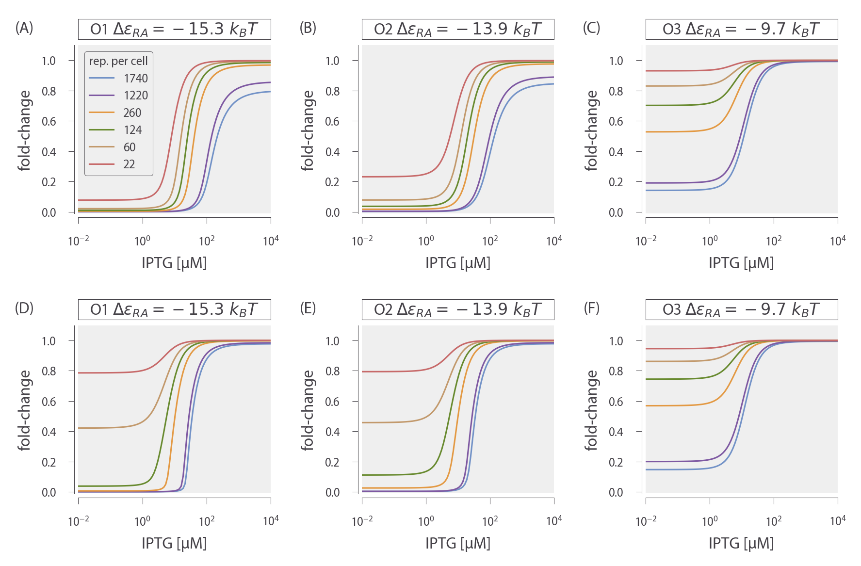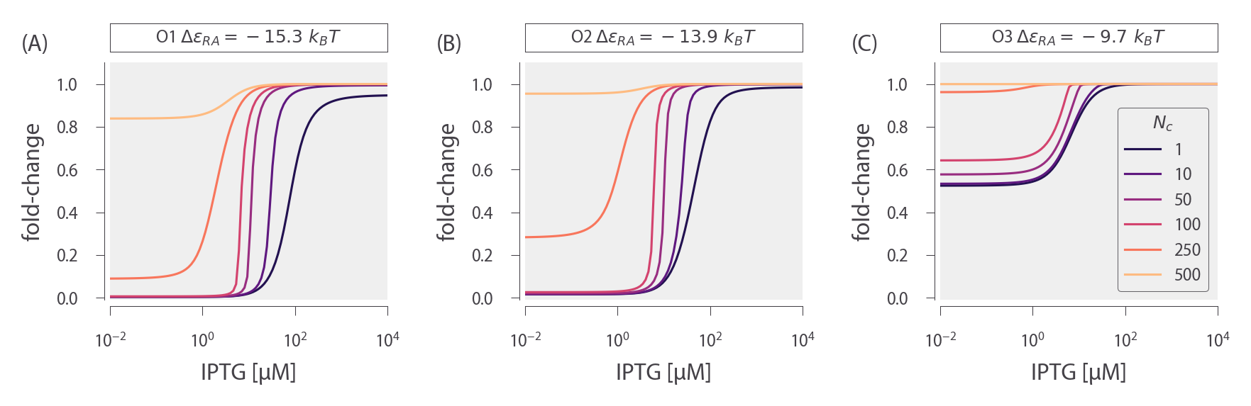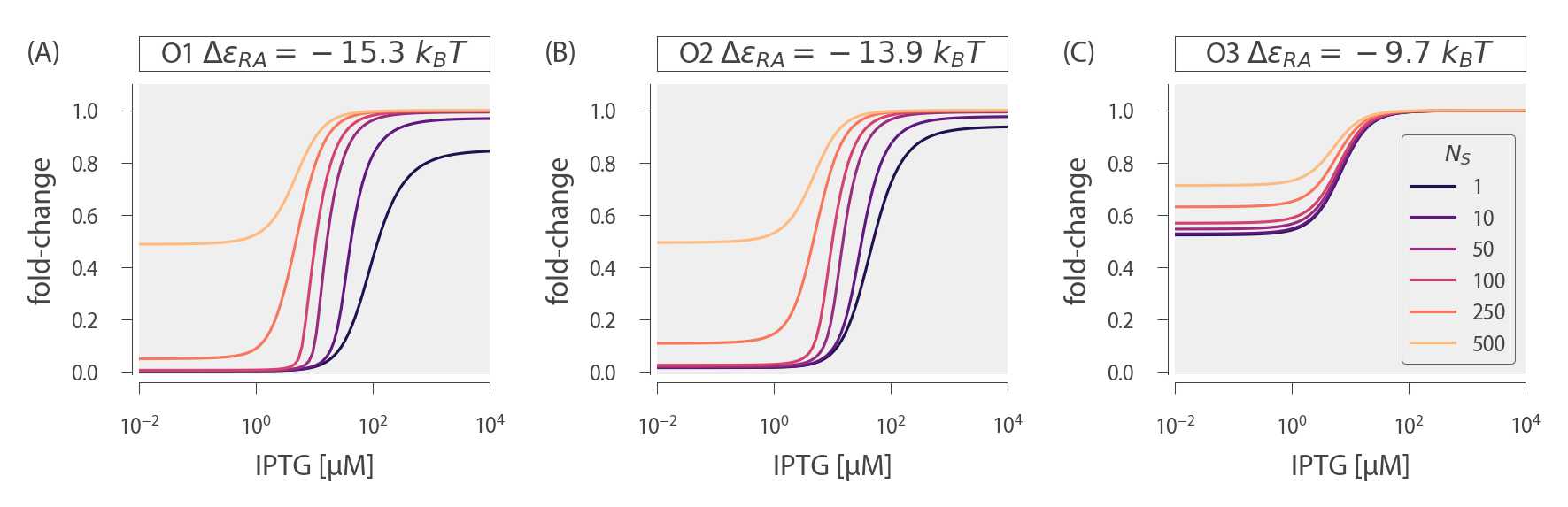 In Chapter 2, we consider the induction profiles of strains with varying R but a single, specific binding site NS = 1. Here, we predict the induction profiles for similar strains in which R is varied, but NS > 1, as shown in Fig. 3. The top row shows induction profiles in which NS = 10 and the bottom row shows profiles in which NS = 100, assuming three different choices for the specific operator binding sites given by the O1, O2, and O3 operators. These values of NS were chosen to mimic the common scenario in which a promoter construct is placed on either a low or high copy number plasmid. A few features stand out in these profiles. First, as the magnitude of NS surpasses the number of repressors R, the leakiness begins to increase significantly, since there are no longer enough repressors to regulate all copies of the promoter of interest. Second, in the cases where ΔεRA = − 15.3 kBT for the O1 operator or ΔεRA = − 13.9 kBT for the O2 operator, the profiles where NS = 100 are notably sharper than the profiles where NS = 10, and it is possible to achieve dynamic ranges approaching 1. Finally, it is interesting to note that the profiles for the O3 operator where ΔεRA = − 9.7 kBT are nearly indifferent to the value of NS.
