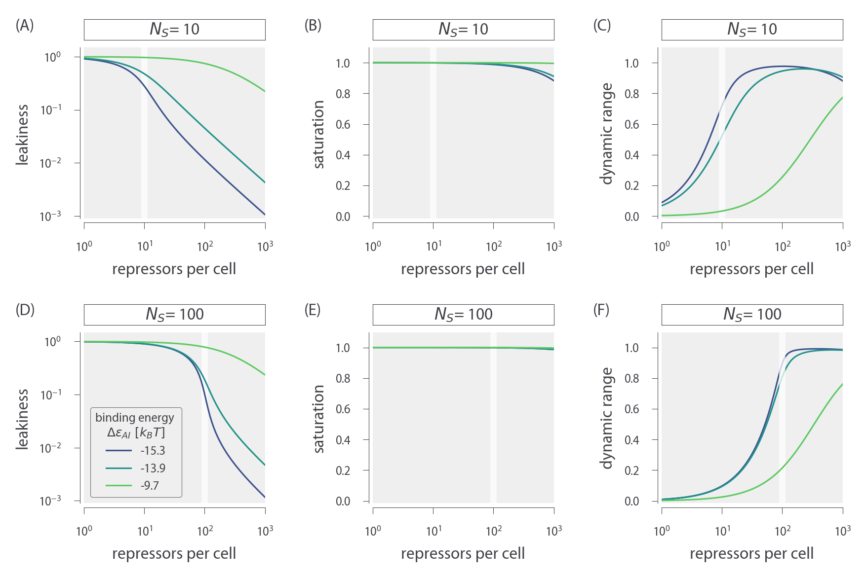 ch6_figS3.py) used to generate this figure can be found on the thesis GitHub repository.Variable Number of Specific Binding Sites NS with Fixed Repressor Copy Number (R)