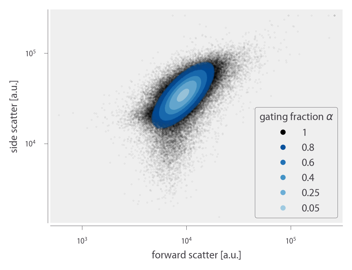 Flow cytometry data will frequently include a number of spurious events or other undesirable data points such as cell doublets and debris. The process of restricting the collected data set to those data determined to be “real” is commonly referred to as gating. These gates are typically drawn manually and restrict the data set to those points which display a high degree of linear correlation between their forward-scatter (FSC) and side-scatter (SSC). The development of unbiased and unsupervised methods of drawing these gates is an active area of research (Aghaeepour et al. 2013).