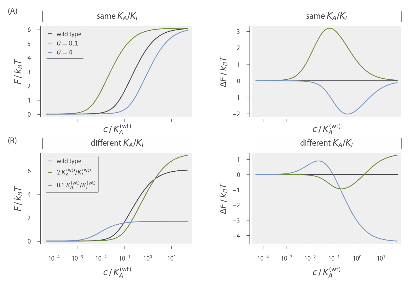 Fig. 1 shows the non-monotonic behavior of ΔF when KA and KI change by the same factor θ (maintaining the wild-type ratio, Fig. 1 (A)) and when KA and KI change by different factors (Fig. 1 (B)). In both cases, non-monotonic behavior is observed with the peak difference in the free energy covering several kBT. We have hosted an interactive figure similar to Fig. 1 on the paper website where the reader can modify how KA and KI are affected by a mutation and examine how the active probability, free energy difference, and ∂βΔF/∂c are tuned.