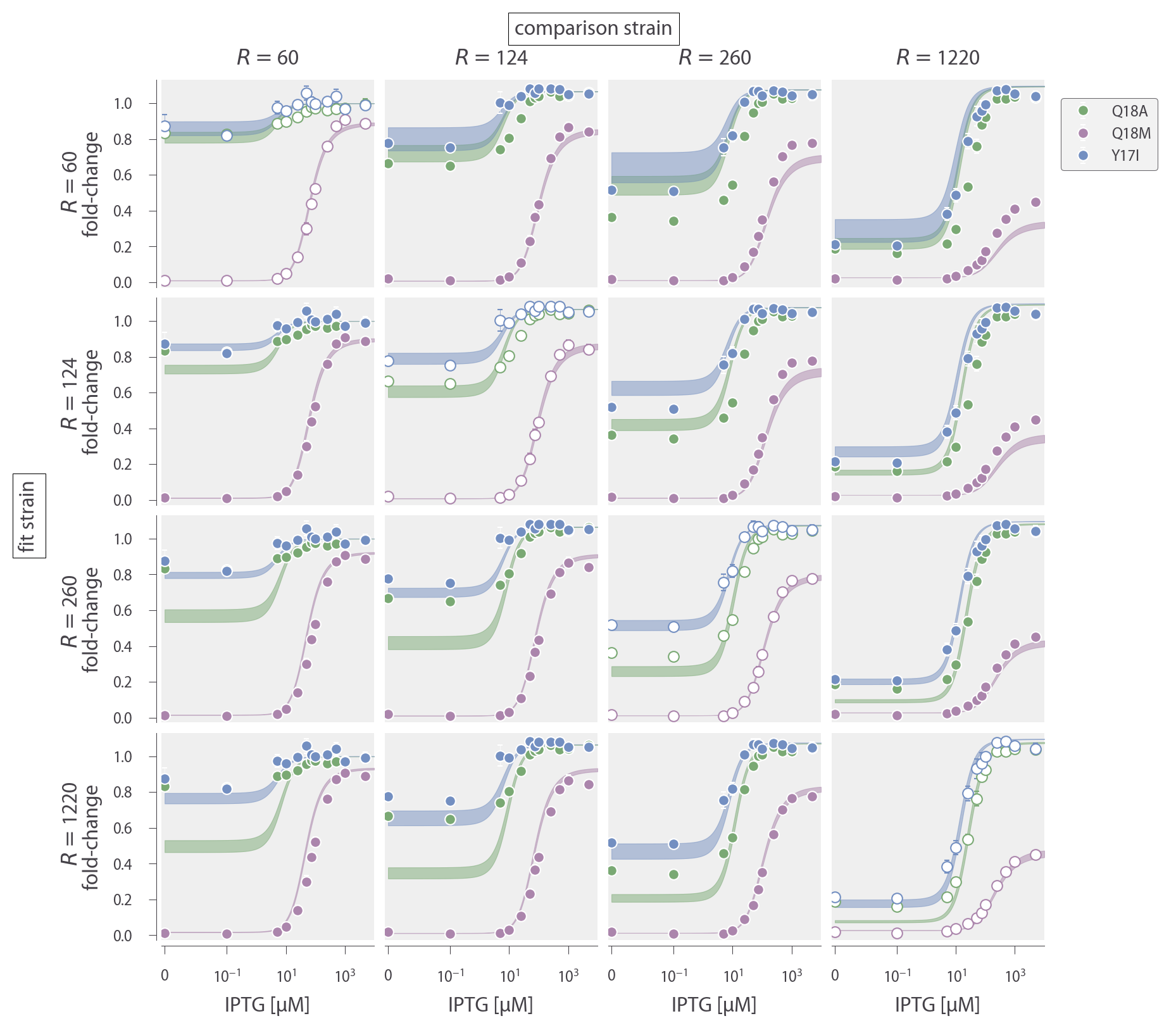 | Q18A | O2 | 124 | MG1655::ΔlacIZYA; galK<>25O2+11-YFP; ybcN<>3*1-RBS446LacI(Q18A) |