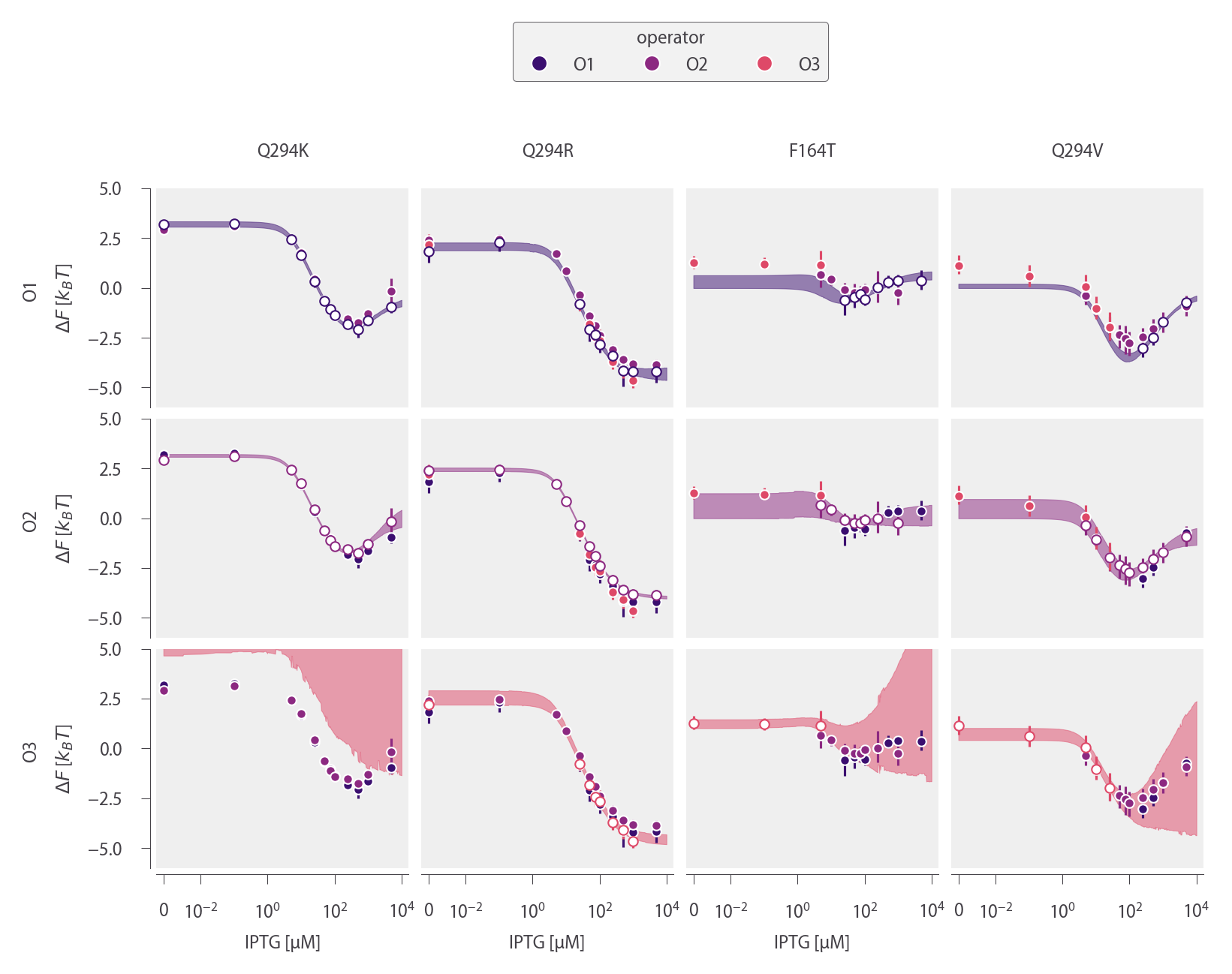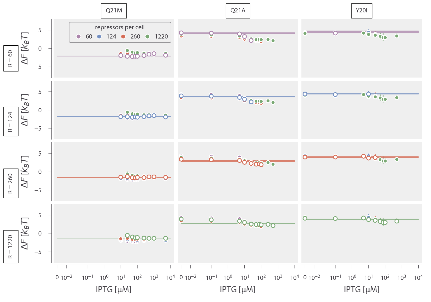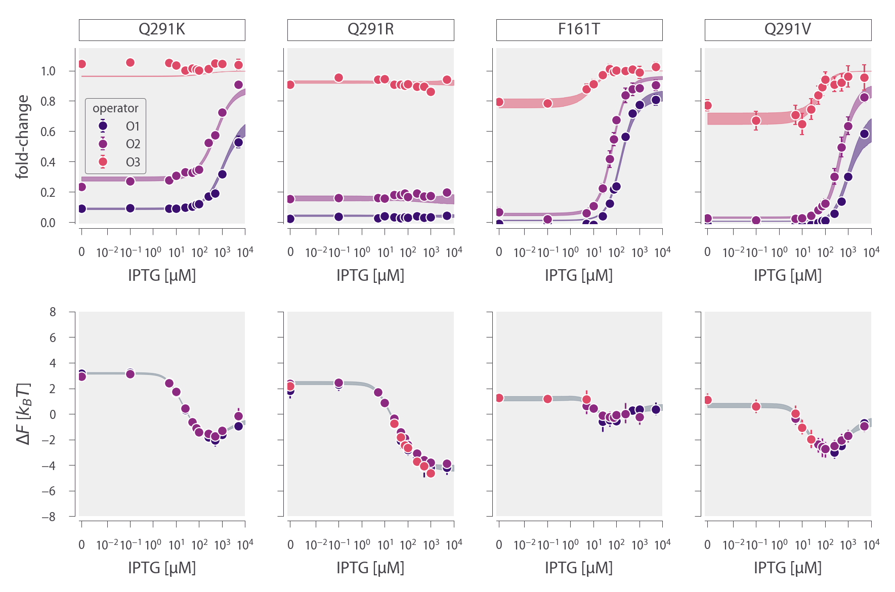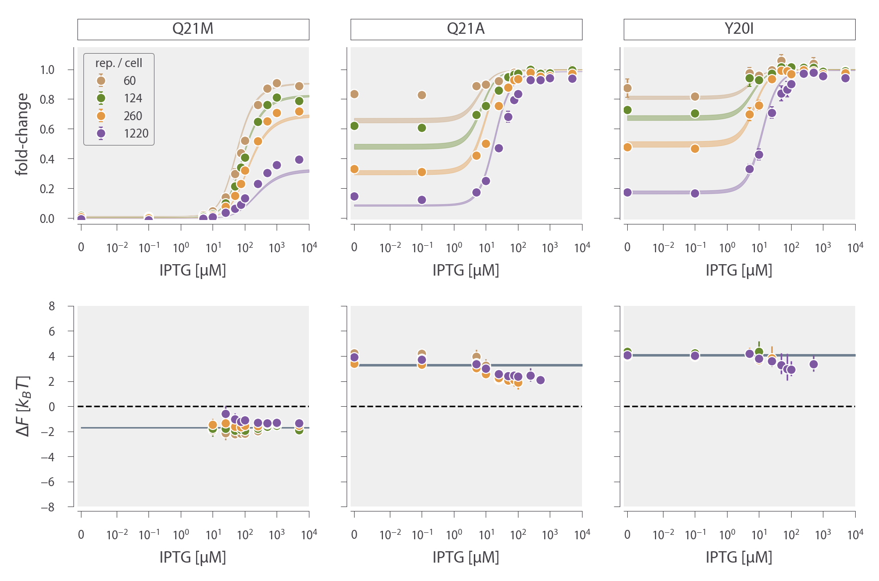 A version of this chapter originally appeared as Chure, G, Razo-Mejia, M., Belliveau, N.M., Kaczmarek, Zofii A., Einav, T., Barnes, Stephanie L., Lewis, M., and Phillips, R. (2019). Predictive shifts in free energy couple mutations to their phenotypic consequences. PNAS 116(37) DOI: https://doi.org/10.1073/pnas.1907869116. G.C., M.R.M, N.M.B., Z.A.K., and S.L.B designed the experiments and collected and analyzed data. G.C. developed theoretical treatment of free energy shifts. G.C., M.R.M, N.M.B., Z.A.K., T.E., S.L.B., and R.P. designed the research project. G.C. and R.P. wrote the paper. M.L. provided guidance and advice.