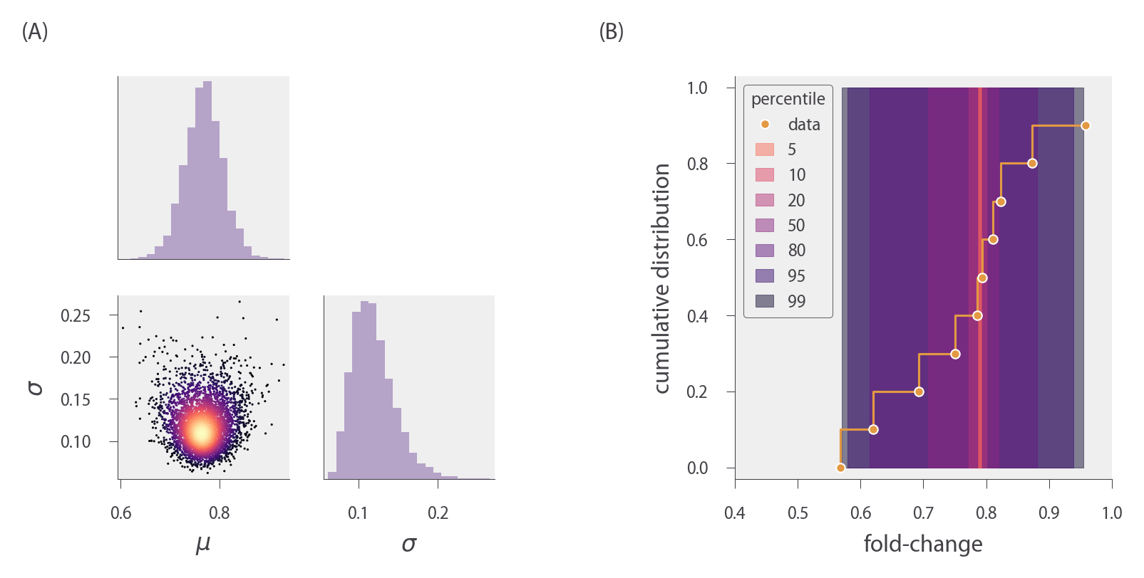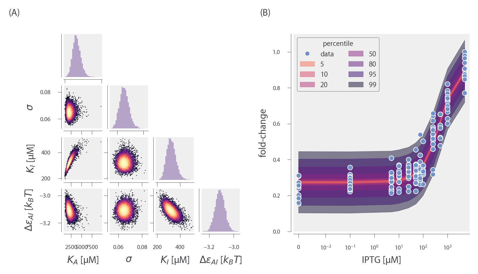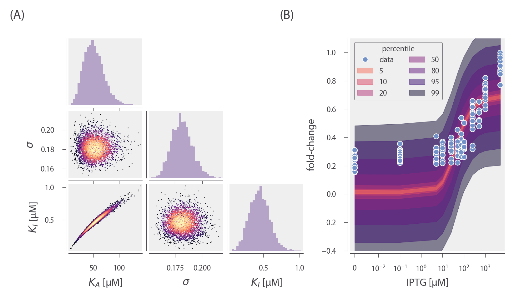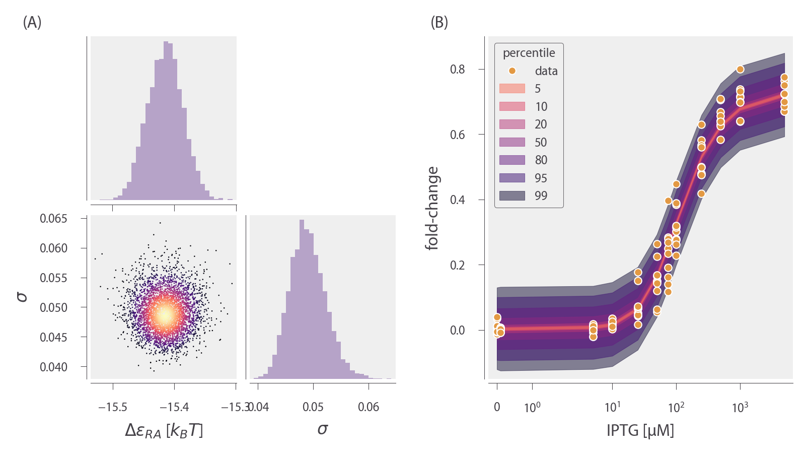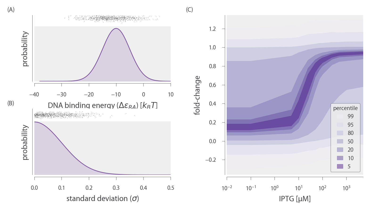 The draws from the priors are shown in Fig. 2 (A) and (B) as black points above the corresponding distribution. To display the results, we computed the percentiles of the simulated data sets at each inducer concentration. These percentiles are shown as red shaded regions in Fig. 2 (C). The 5th percentile (dark purple band) has the characteristic profile of an induction curve. Given that the prior distribution for ΔεRA is centered at − 12 kBT and we chose R = 260, we expect the generated data sets to cluster about the induction profile defined by these values. More importantly, approximately 95% of the generated data sets fall between fold-change values of -0.1 and 1.1, which is within the realm of possibility given the systematic and biological noise in our experiments. The 99th percentile maximum is approximately 1.3 and the minimum approximately − 0.3. While we could tune our choice of prior further to minimize draws this far from the theoretical bounds, we err on the side of caution and accept these values as it is possible that fold-change measurements this high or low can be observed, albeit rarely. Through these prior predictive checks, we feel confident that these choices of priors are appropriate for the parameters we wish to estimate. We can now move forward and make sure that the statistical model as a whole is valid and computationally tractable.