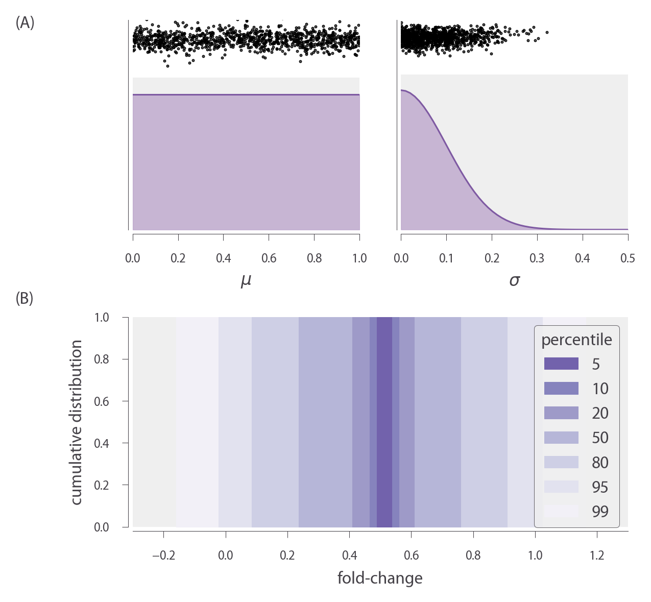 While these choices for the priors seem reasonable, we can check their appropriateness by using them to simulate a data set and checking that the hypothetical fold-change measurements obey our physical and physiological intuition.