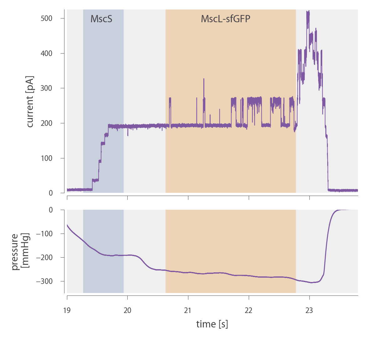 Excised, inside-out patches were analyzed at a membrane potential of -20 mV with pipette and bath solutions containing 200 mM KCl, 90 mM MgCl2, 10 mM CaCl2, and 5 mM HEPES buffer at pH 7. All data were acquired at a sampling rate of 50 kHz with 5 kHz filtration using an AxoPatch 200B amplifier and pClamp software (Molecular Devices). The pressure threshold for activation of a single MscS channel (blue stripe in Fig. 1) was compared to that of single MscL channels (orange strip in Fig. 1). The pressure threshold for activation of the MscL channels was referenced against the activation threshold of MscS to determine the pressure ratio (PL:PS) for gating as previously described (Blount et al. 1996). Recordings of the transmembrane current were made of three individual patches with an average PL:PS ratio of 1.56 for MscL-sfGFP. This ratio quantitatively agrees with the PL:PS ratio of 1.54 measured in a strain (MJF429 from the Booth laboratory) which expresses the wild-type MscL protein from the chromosome. The average transient current change from MscL openings (Fig. 1 shaded orange region) is 75 pA, corresponding to a single channel conductance of 3.7 nS, comparable to the reported values of wild-type MscL. The agreement between these two strains indicates that there is negligible difference in functionality between MscL and MscL-sfGFP, allowing us to make physiological conclusions of the wild-type channel from our experiments.