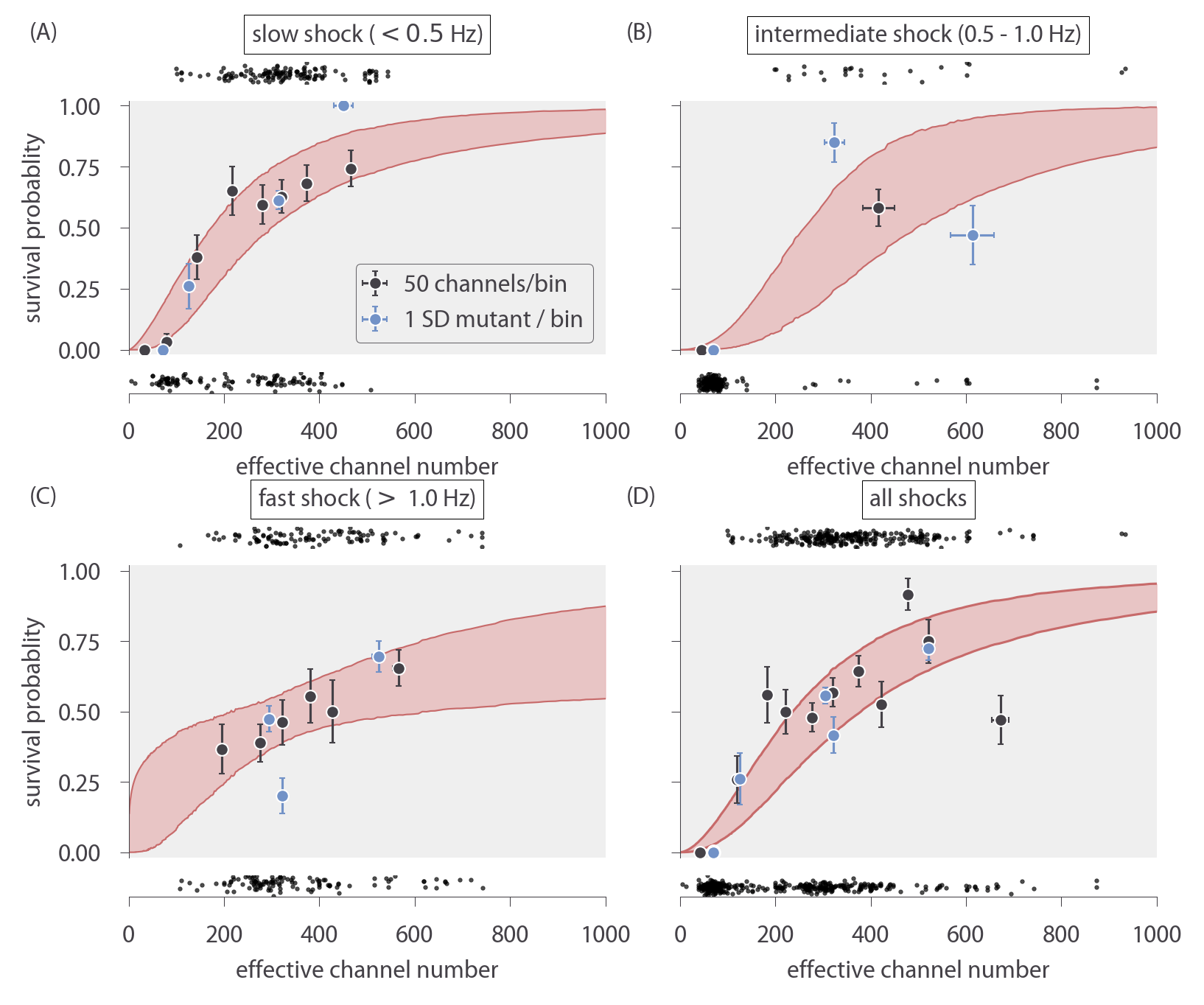 Using this generalization, we can use both shock rate and the effective channel copy number as predictor variables. The resulting two-dimensional surface of survival probability is shown in Fig. 9 (D). As is suggested by Fig. 9 (C), the magnitude of change in survivability as the shock rate is increased is smaller than that along the increasing channel copy number, supporting our conclusion that for MscL alone, the copy number is the most important variable in determining survival.