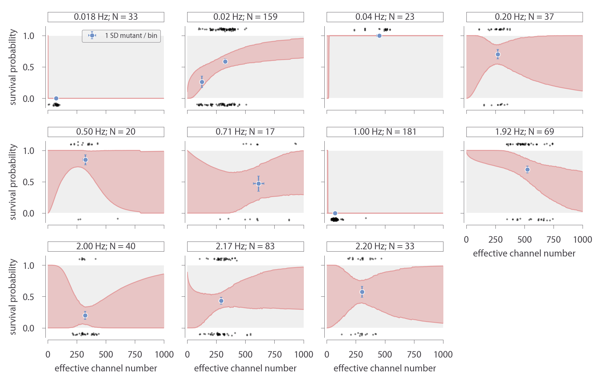 As is discussed in Chapter 5, we used a bin-free method of estimating the survival probability given the MscL channel copy number as a predictor variable. While this method requires no binning of the data, it requires a data set that sufficiently covers the physiological range of channel copy number to accurately allow prediction of survivability. Fig. 10 shows the results of the logistic regression treating each shock rate as an individual data set. The most striking feature of the plots shown in Fig. 10 is the inconsistent behavior of the predicted survivability from shock rate to shock rate. The appearance of bottle necks in the credible regions for some shock rates (0.2Hz, 0.5Hz, 2.00Hz, and 2.20 Hz) appear due to a high density of measurements within a narrow range of the channel copy number at the narrowest point in the bottle neck. While this results in a seemingly accurate prediction of the survival probability at that point, the lack of data in other copy number regimes severely limits our extrapolation outside of the copy number range of that data set. Other shock rates (0.018 Hz, 0.04 Hz, and 1.00 Hz) demonstrate completely pathological survival probability curves due to either complete survival or complete death of the population.